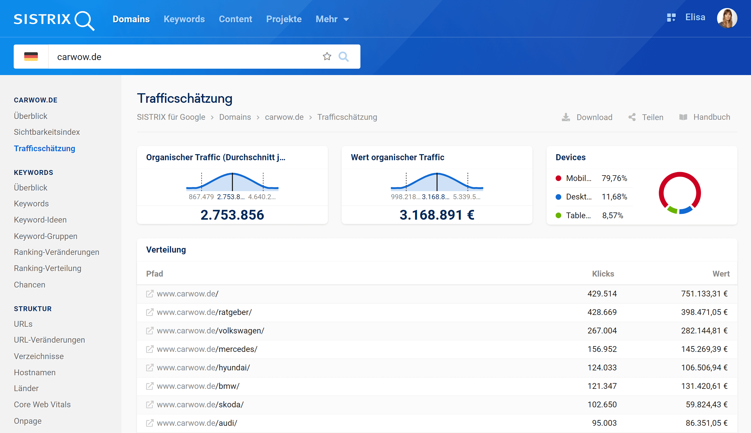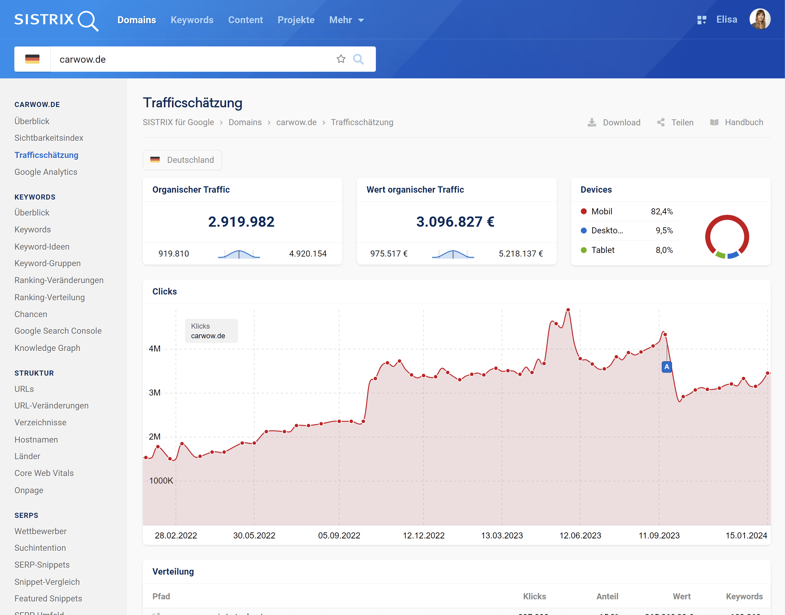 In der Tabelle „Verteilung“ findest du für jedes Verzeichnis der Domain den durchschnittlich erhaltenen Klickwert pro Monat und die Kosten, die für den Kauf dieses Traffics über Google Ads anfallen würden.