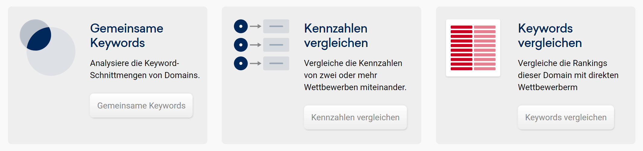Basierend auf den Keywords mit Rankings in den Top-100 (Ranking-Keyword-Set) der untersuchten Domain werden andere Domains angezeigt, die ebenfalls zu diesem Keyword-Set Rankings besitzen. Diese Domains sind die stärksten Keyword-Wettbewerber.