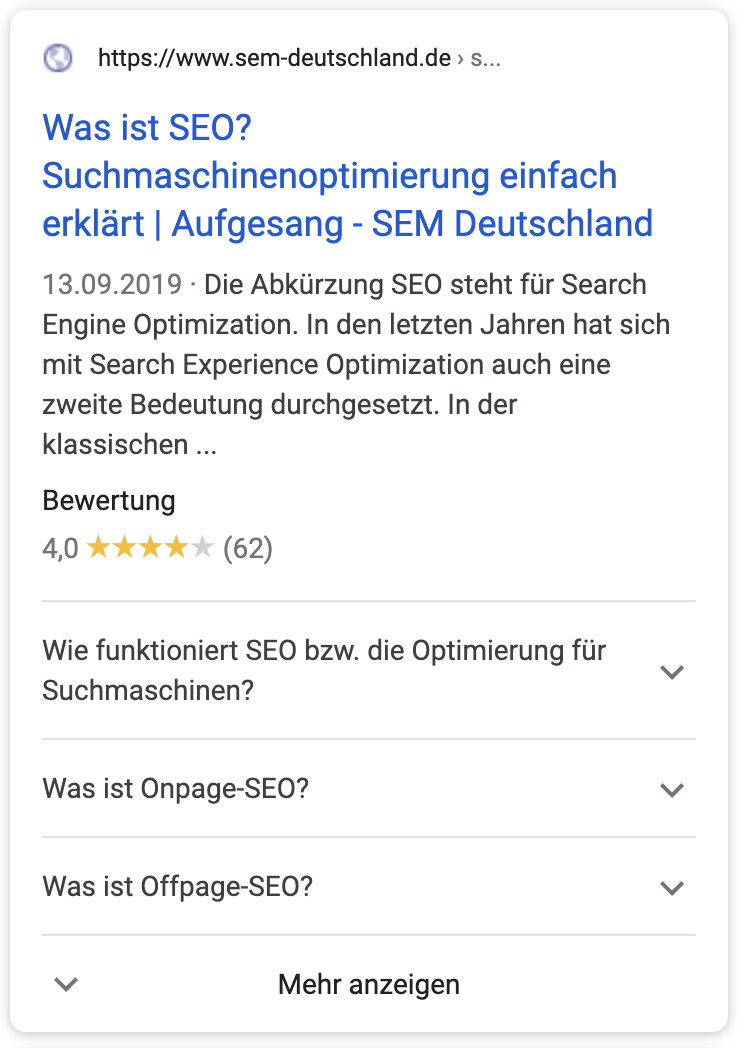 Featured Snippets sind besonders hervorgehobene, organische Suchtreffer. Durch ein umfangreicheres und auch optisch größeres Snippet (als Text, Bild, Tabelle oder Aufzählung) wird die Suchintention in vielen Fällen bereits durch das Featured Snippet beantwortet.