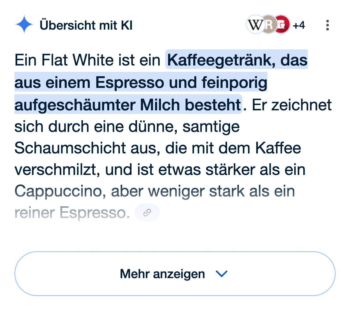 AI Overviews sind von Google automatisch generierte Zusammenfassungen, die bei bestimmten Suchanfragen direkt oberhalb der organischen Treffer erscheinen. Sie beantworten Nutzerfragen mithilfe von Informationen aus verschiedenen Webseiten und kombinieren diese zu einem eigenen Textblock.