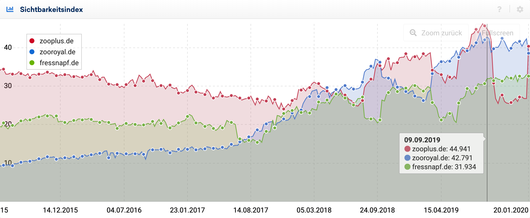 Als Erfinder des Sichtbarkeitsindex erheben wir diese Kennzahl seit rund 15 Jahren. Auf dieser Grundlage kannst du jede beliebige Domain (oder Subdomain, Verzeichnis oder gar einzelne URL) auch rückwirkend im zeitlichen Verlauf analysieren: