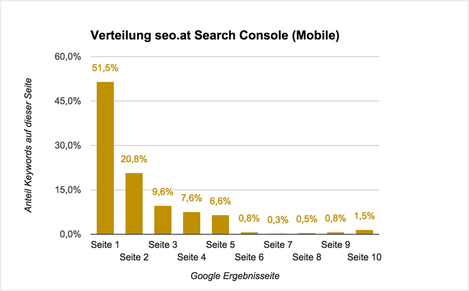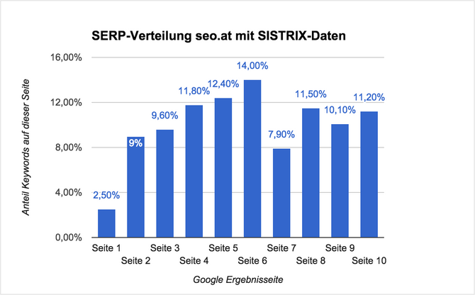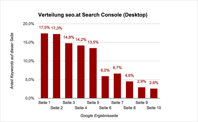 Auf Datenbasis der Toolbox sind 2,5 % der Rankings von seo.at auf Seite 1 zu finden. Laut Google landen hingegen 17,5 % der Rankings von seo.at auf Seite 1: