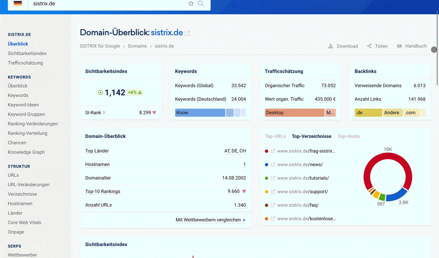 - Entdecke die wichtigsten SEO-KPIs einer Domain, eines Hosts, eines Verzeichnisses oder einer URL.