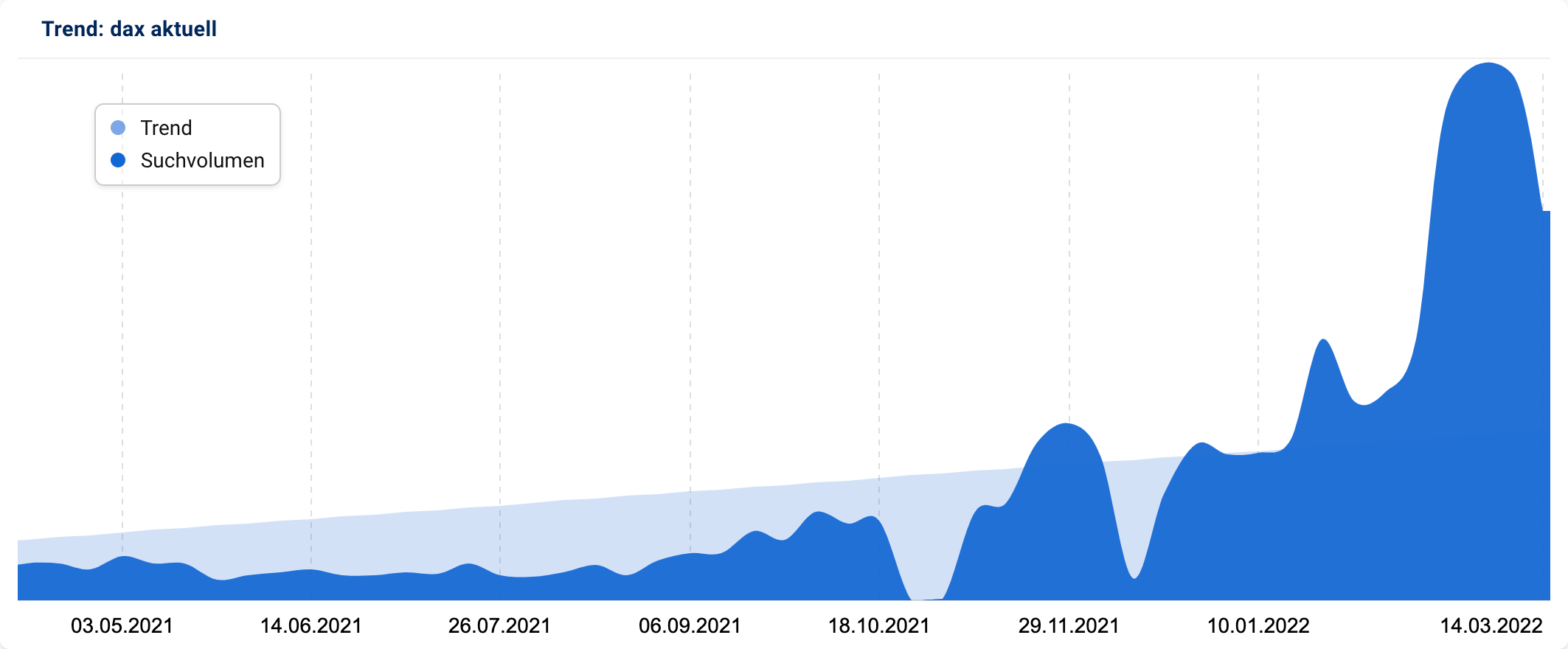 Nach oben geschossen sind in den vergangenen Wochen auch die Suchanfragen zu Begriffen rund um den DAX – stellvertretend für zahlreiche Aktienkurse. Die Unsicherheit durch die Ukraine-Krise, die dann im Einmarsch von Putins Truppen gipfelte, spielte auch hier eine Rolle.