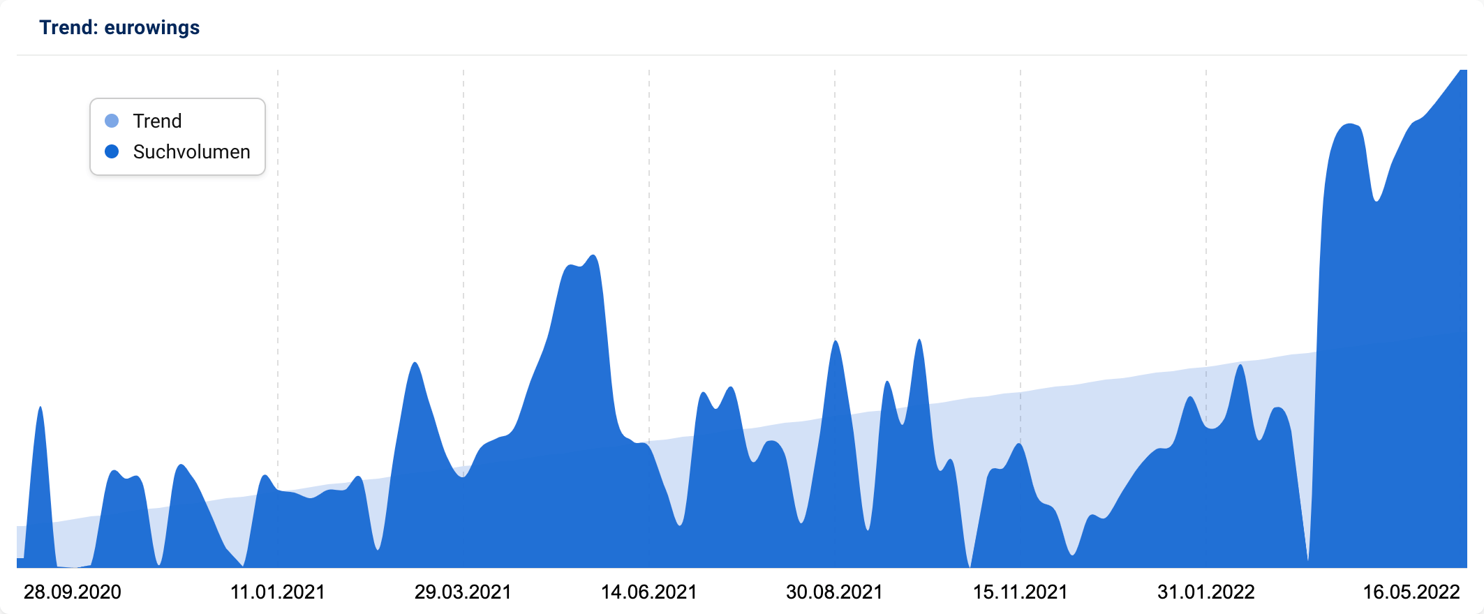 Seit dem Frühjahr steigen die Suchanfragen nach allem was mit dem Buchen von Flügen zu tun hat, massiv an. Das Suchvolumen übersteigt dabei alle Zeiträume der beiden Pandemie-Jahre 2020 und 2021 deutlich. Neben der Lufthansa-Tochter Eurowings verzeichnen auch Anfragen nach “Google Flights”, “Easyjet”, “Corendon Airlines”, “WizzAir” oder ganz einfach “Flug buchen” deutliche Anstiege.