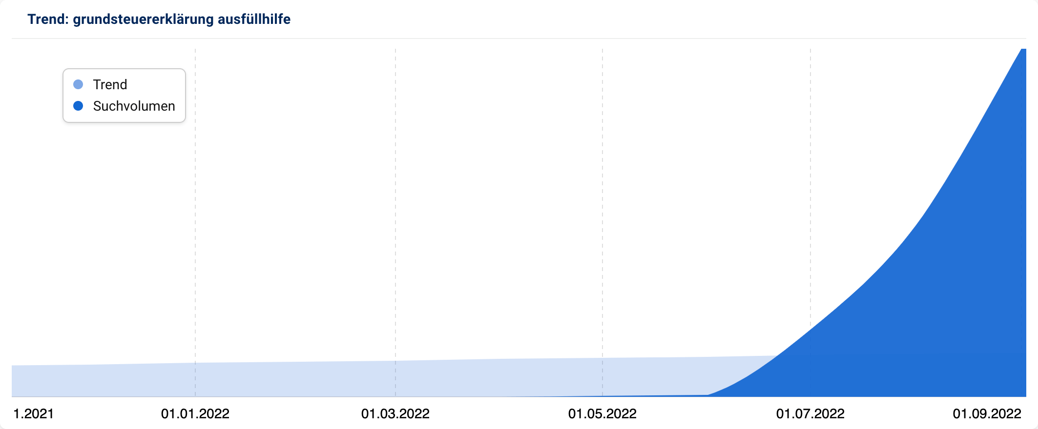 Unter den Keywords, die in den vergangenen Monaten einen extremen Anstieg verzeichnet haben, sind unzählige zur Grundsteuer, darunter alle Bundesländer verbunden mit dem Wort “Grundsteuer”, also “Grundsteuer Bayern”, “Grundsteuer NRW”, usw. Ebenfalls vorn dabei – und da zeigt sich das Problem besonders gut: “Grundsteuererklärung Ausfüllhilfe”.