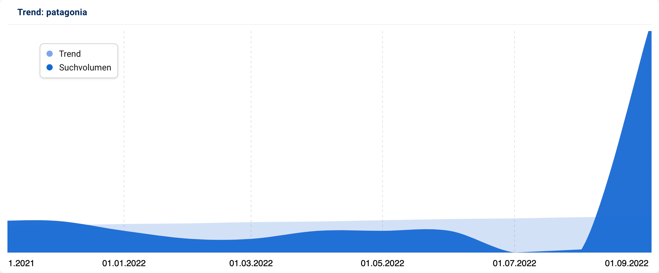 Das Suchvolumen zum Keyword “Patagonia” lag daraufhin ungefähr beim Fünffachen der bisherigen Peaks. Wie viele derjenigen, die nach der Marke gesucht haben, anschließend auch Produkte gekauft haben, ist natürlich nicht bekannt, doch ein paar Euros für den Klimaschutz werden sicher dabei ausgegeben worden sein.