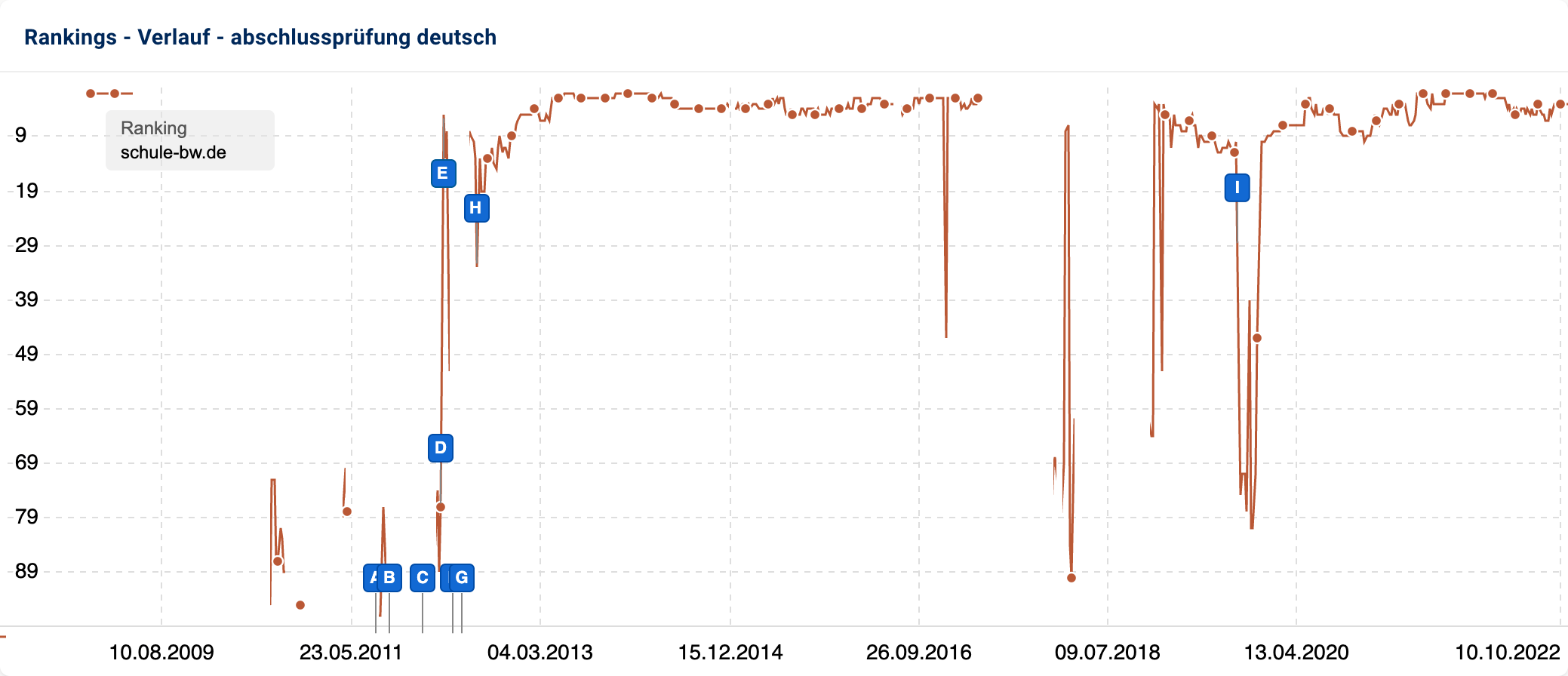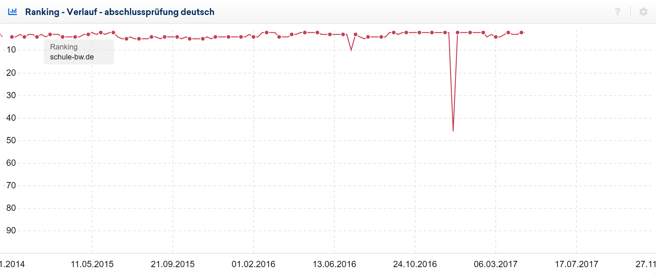 Um zu überprüfen, ob dies auch für die Domain schule-bw.de gilt, analysieren wir die verlorenen Keywords hinsichtlich ihres Ranking-Verlaufs. Hier am Beispiel des Keywords „abschlussprüfung deutsch“.
