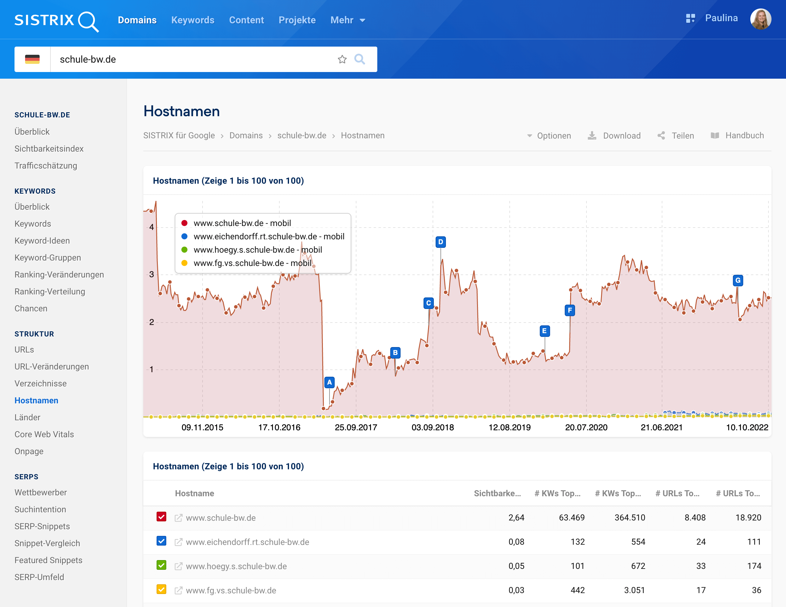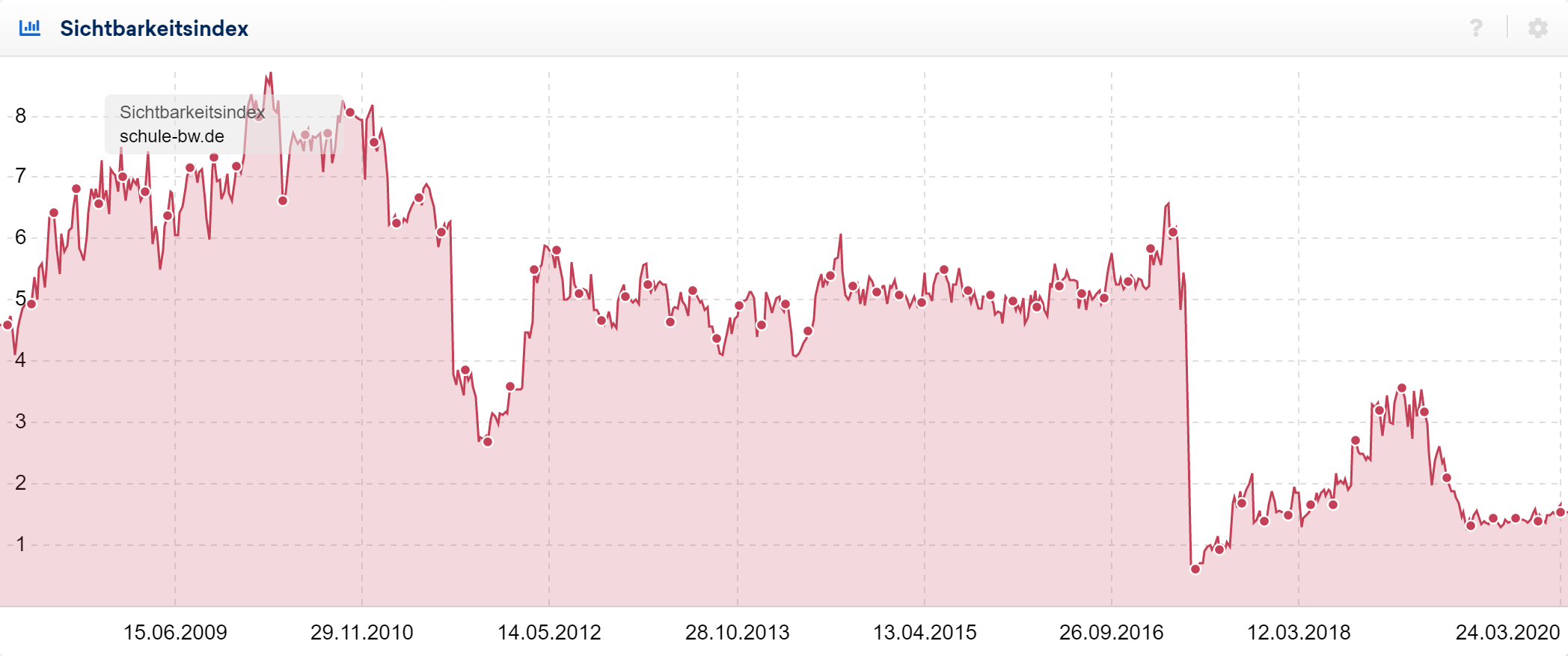 Für unser Beispiel stellen wir fest, dass alle relevanten Verzeichnisse der Domain schule-bw.de an Sichtbarkeit verloren haben.