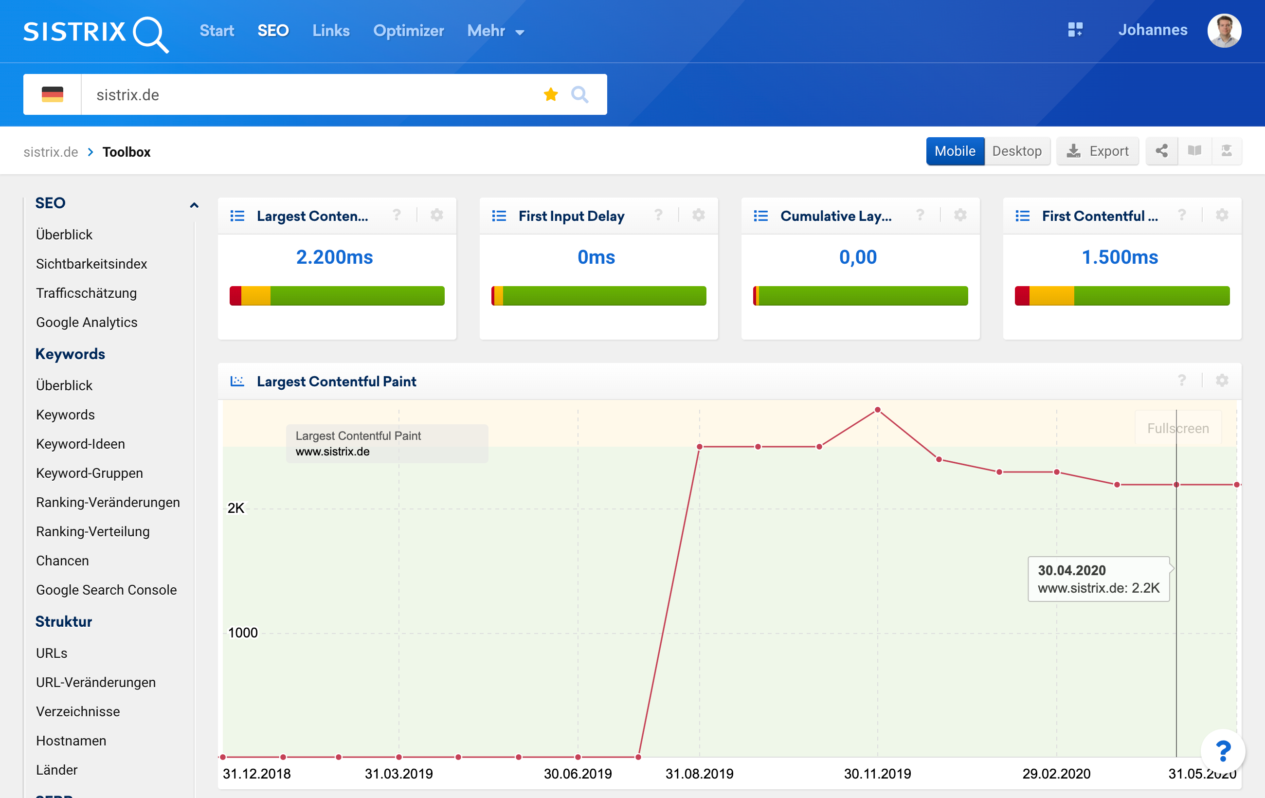 Mit den Core Web Vitals ermöglicht Google die Performance-Messung von Webseiten auf einer einheitlichen Basis. Das komplexe Thema wird damit zwar nicht weniger komplex, aber immerhin einfacher mess- und bewertbar. In SISTRIX hast du Zugriff auf Labor- und Feld-Daten und kannst Webseiten somit optimal bewerten und verbessern.
