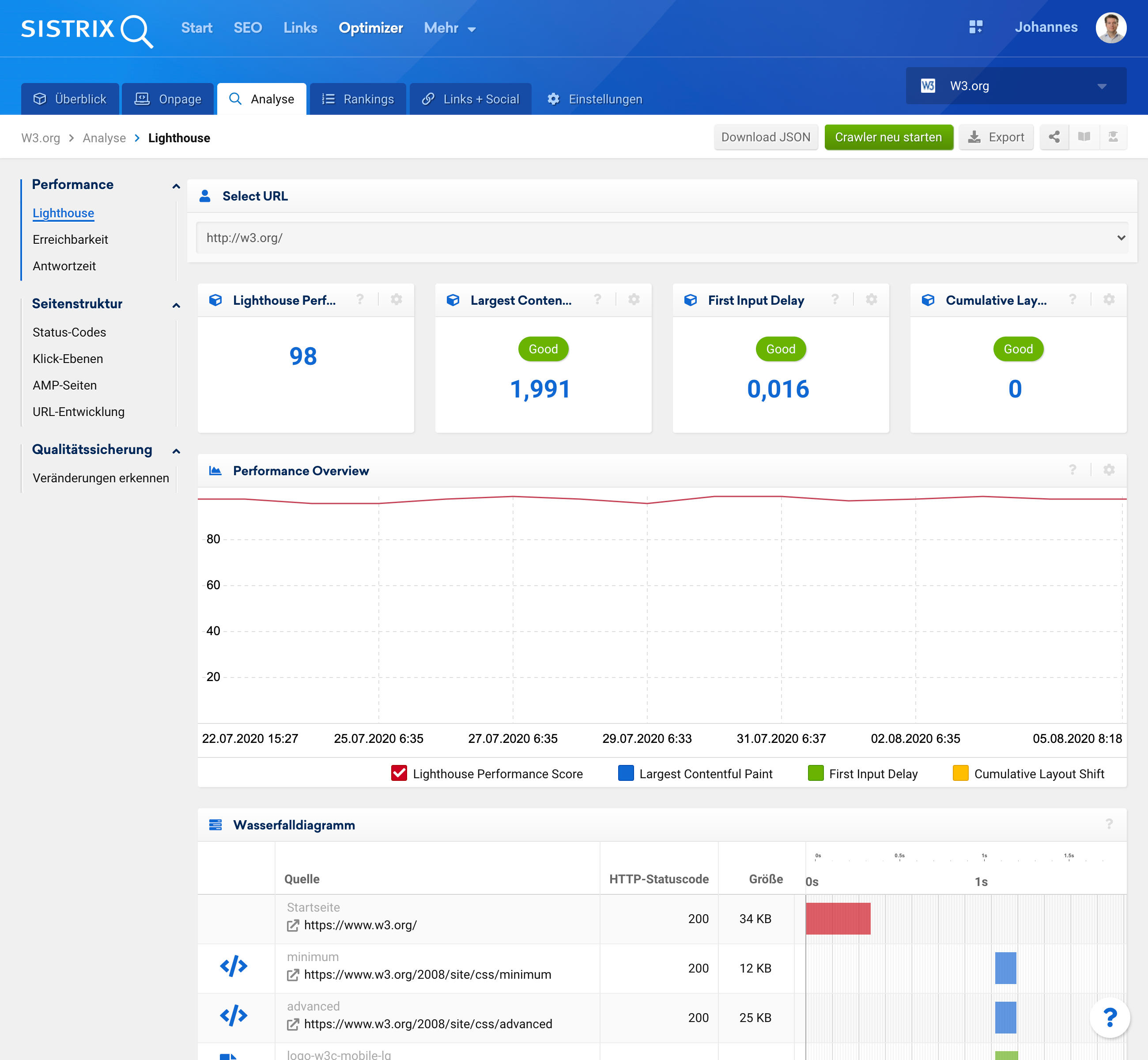 In SISTRIX werden Labor-Daten in den Onpage-Projekten ermittelt. Die dortige Performance-Messung basiert seit Juli 2020 auf Google Lighthouse. Diese Lighthouse-Messungen werden automatisch einmal pro Tag durchgeführt. Ihre Ergebnisse werden ebenfalls automatisch dauerhaft gespeichert. Neben vielen weitere spannenden Kennzahlen ermittelt Google Lighthouse auch die Core Web Vitals.