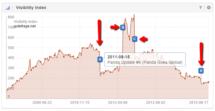 Ein Beispiel für die globalen Google-Update-Pins siehst du hier bei der Domain „heilpraxisnet.de“, die von zahlreichen Google Core-Updates betroffen ist: