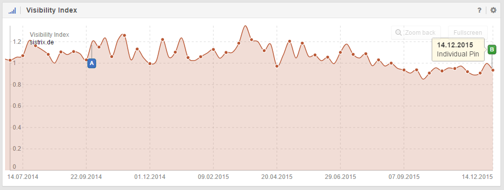 Diese globalen Update-Pins werden standardmäßig nur angezeigt, wenn sich die Sichtbarkeit der untersuchten Domain zu dem Zeitpunkt des Updates um mehr als 15 Prozent verändert hat. Zwar ist die Einblendung des Update-Pins kein Beweis dafür, dass die Domain von diesem Algorithmus-Update betroffen ist, die Wahrscheinlichkeit ist jedoch recht hoch. Trotzdem solltest du jeden Einzelfall prüfen.
