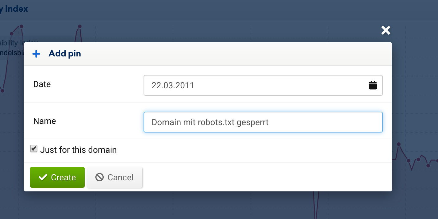 Mit individuellen Ereignis-Pins pro Domain kannst du die Entwicklung der Sichtbarkeit, Ranking-Historie etc. jederzeit zu bestimmten Ereignissen wie einem Relaunch oder dem Wechsel der SEO-Strategie zurückverfolgen. Pins für individuelle Domains können entweder über die Pin-Verwaltung oder in den jeweiligen Graphen hinzugefügt werden.