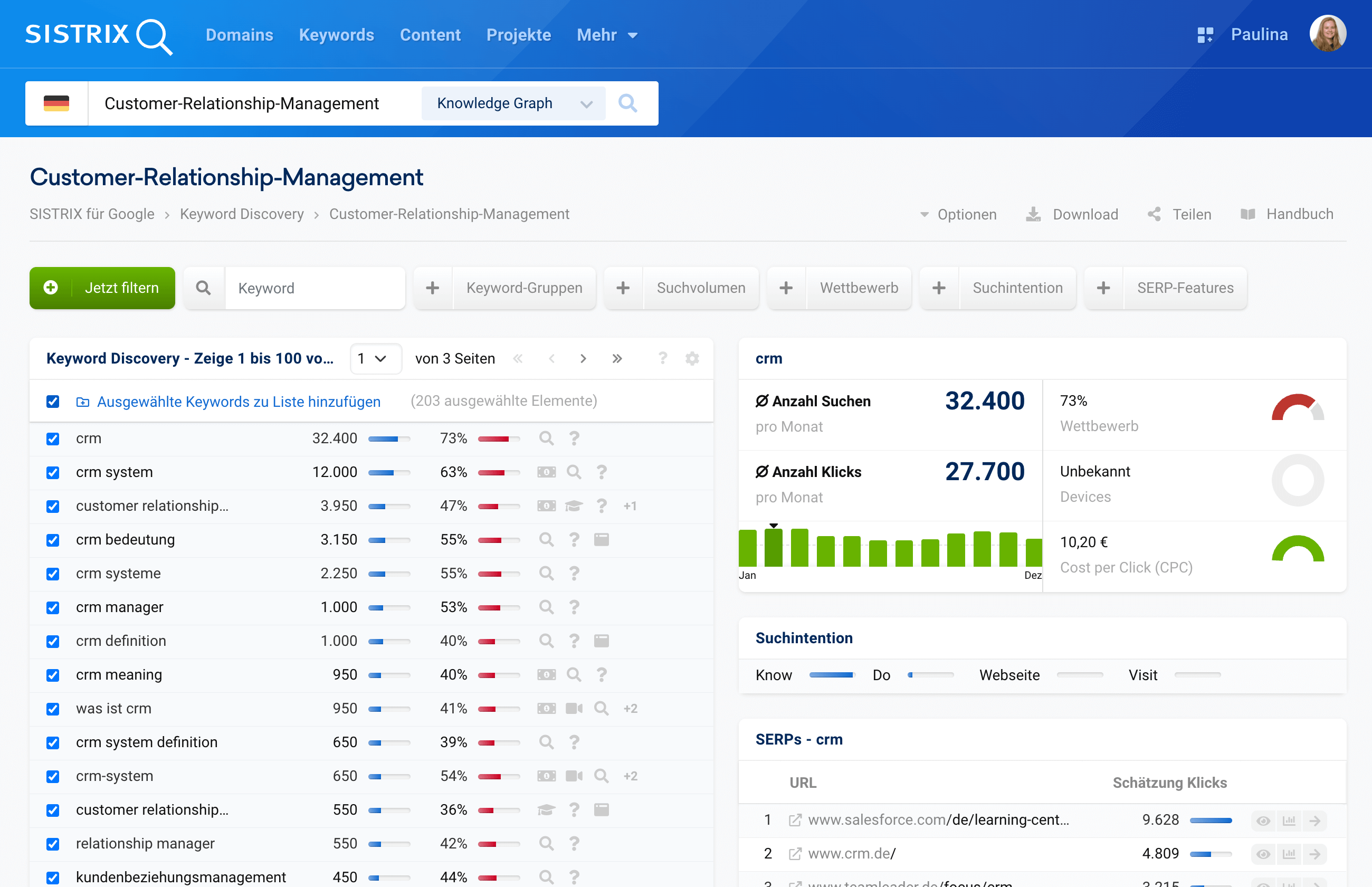 Nun kannst du dir im ersten Schritt die Keywords anschauen, bei denen das Google Knowledge Graph-Panel „Customer-Relationship-Management“ angezeigt wird.