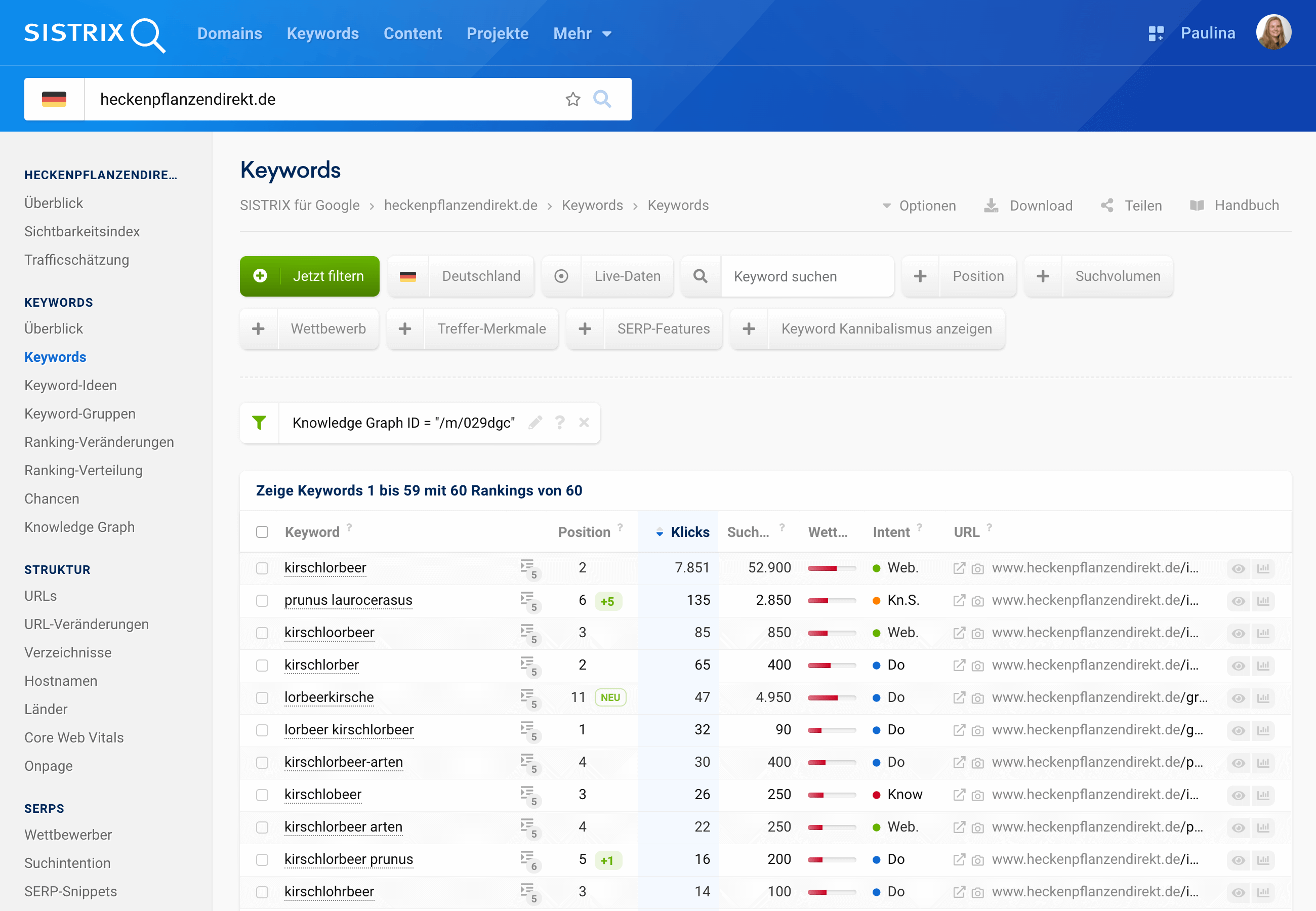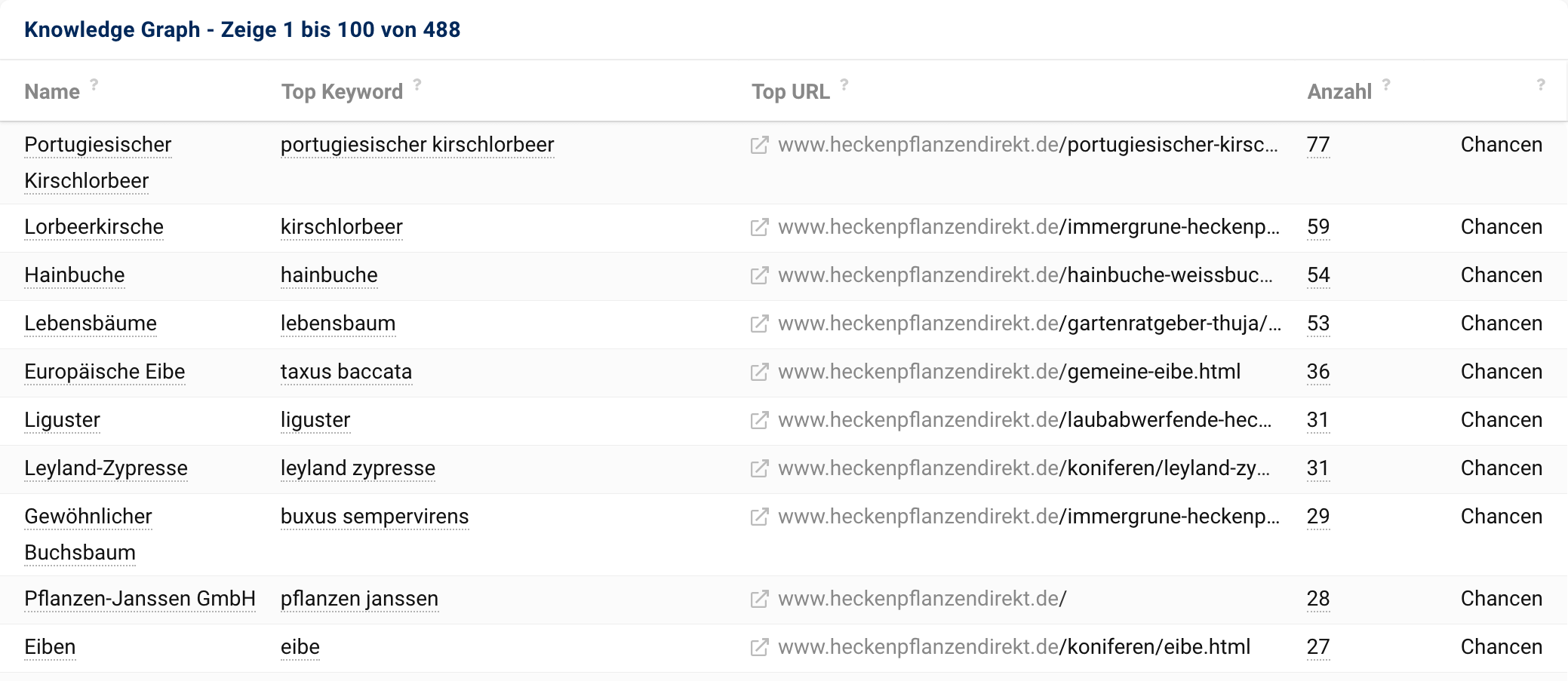 Uns werden nun alle Keywords mit dazugehörigen weiteren Informationen angezeigt, für die die Domain heckenpflanzendirekt.de rankt und bei denen das Knowledge Graph-Panel angezeigt wird.
