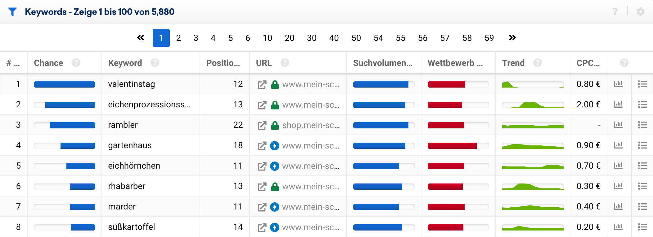 Die Tabelle ist deswegen schon nach dem Chancen-Wert sortiert. So kannst du schnell erkennen, für welche Keywords du deine Seite optimieren solltest, um schnell größere Erfolge zu erzielen. Um die Tabelle nach einem anderen Kriterium zu sortieren, klicke einfach auf die gewünschte Spaltenüberschrift.