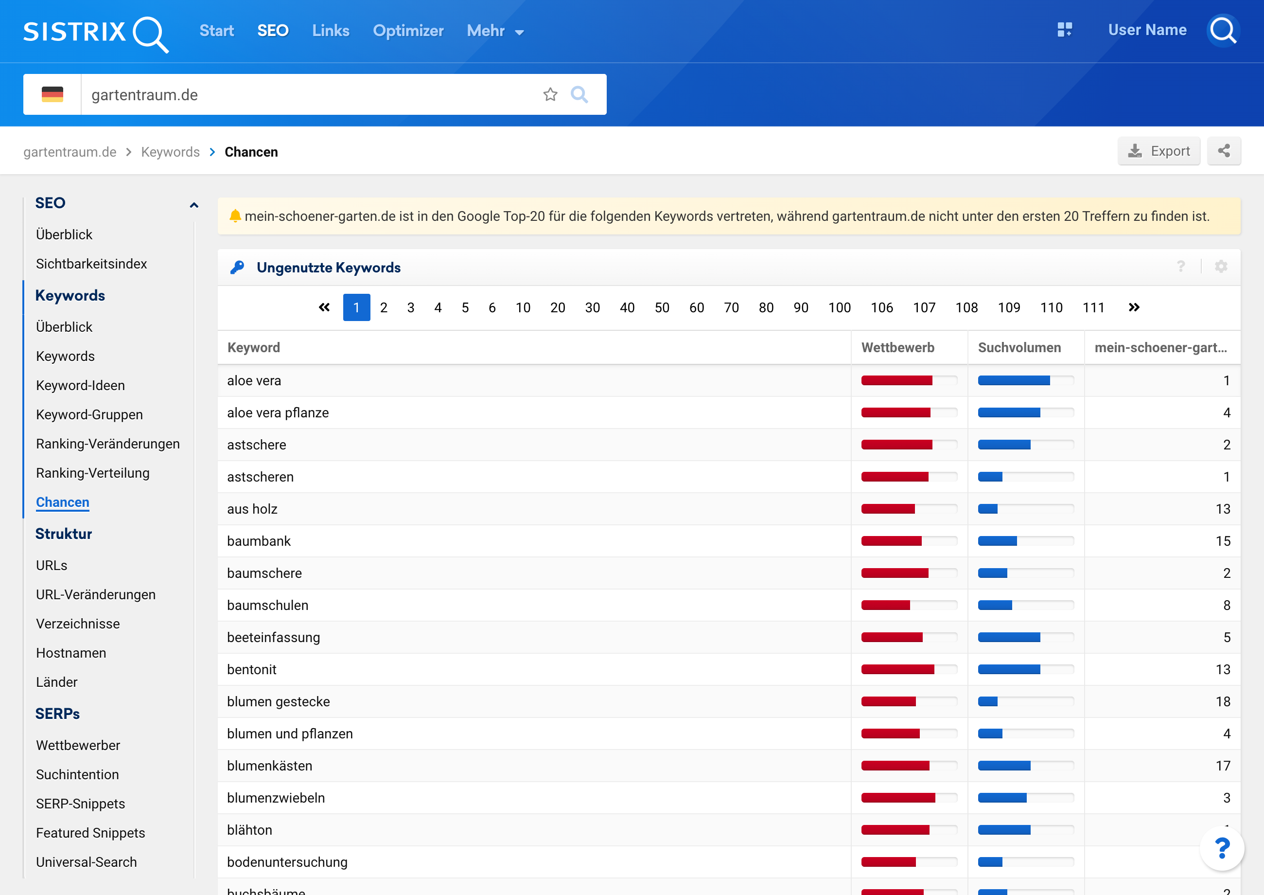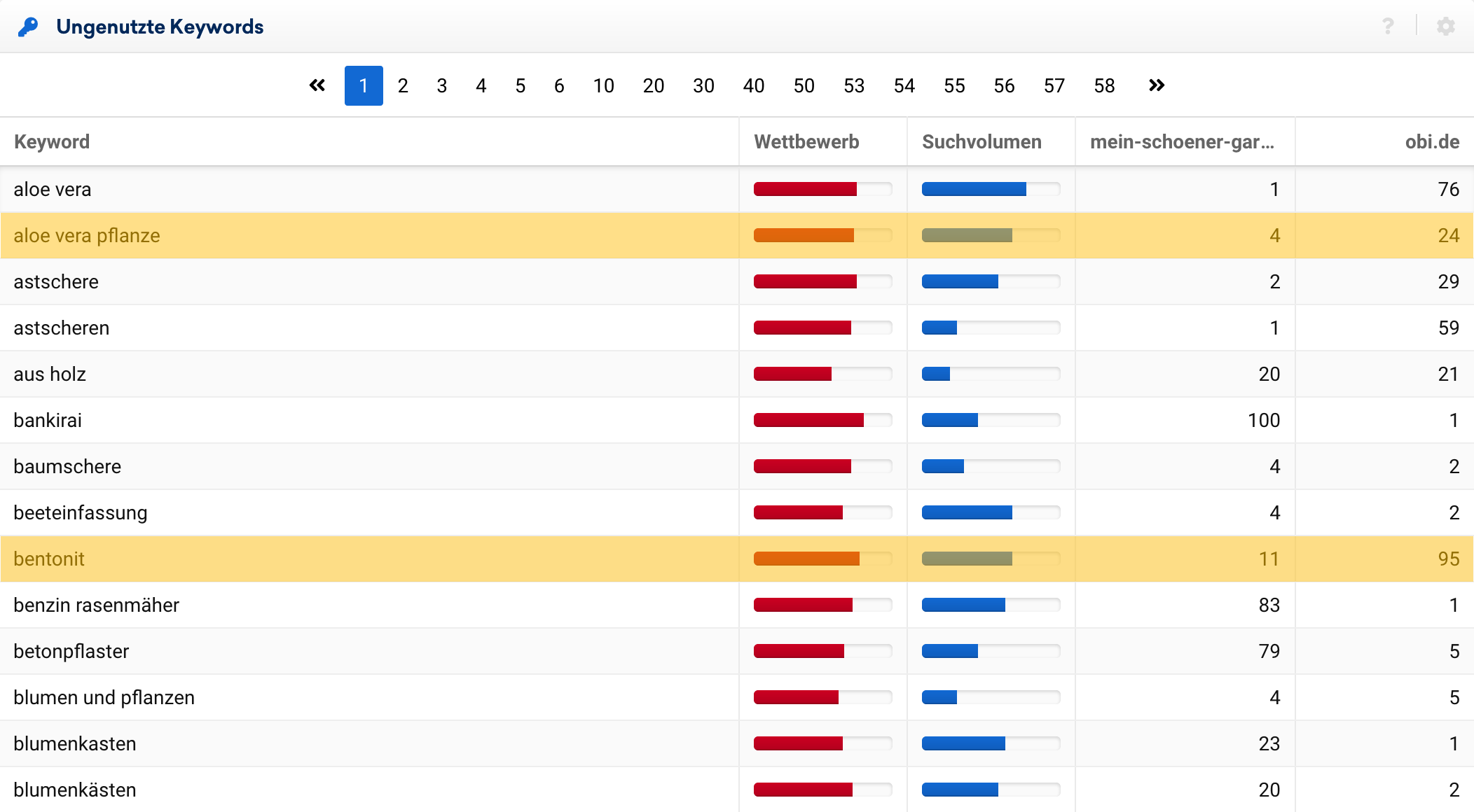 Schauen wir uns zum Beispiel die ungenutzten Keywords der Domain gartentraum.de im Vergleich zu dem Wettbewerber mein-schoener-garten.de an.