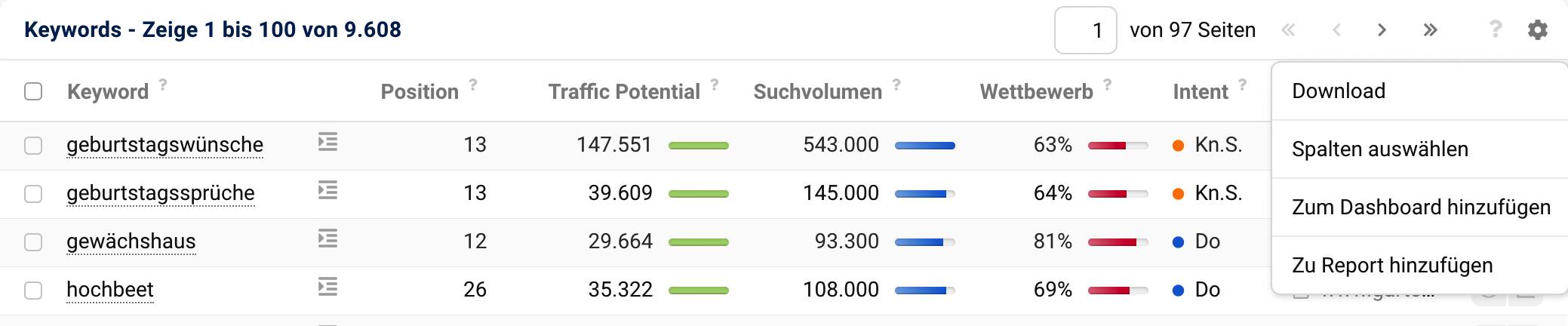 In unserem Beispiel rankt gartentraum.de schon auf Position 13 für „geburtstagswünsche“ und „geburtstagssprüche“ und sogar auf Position 12 für „gewächshaus“. Es fehlen also nur wenige Plätze bis zu einem Ranking auf der ersten Google-Ergebnisseite.