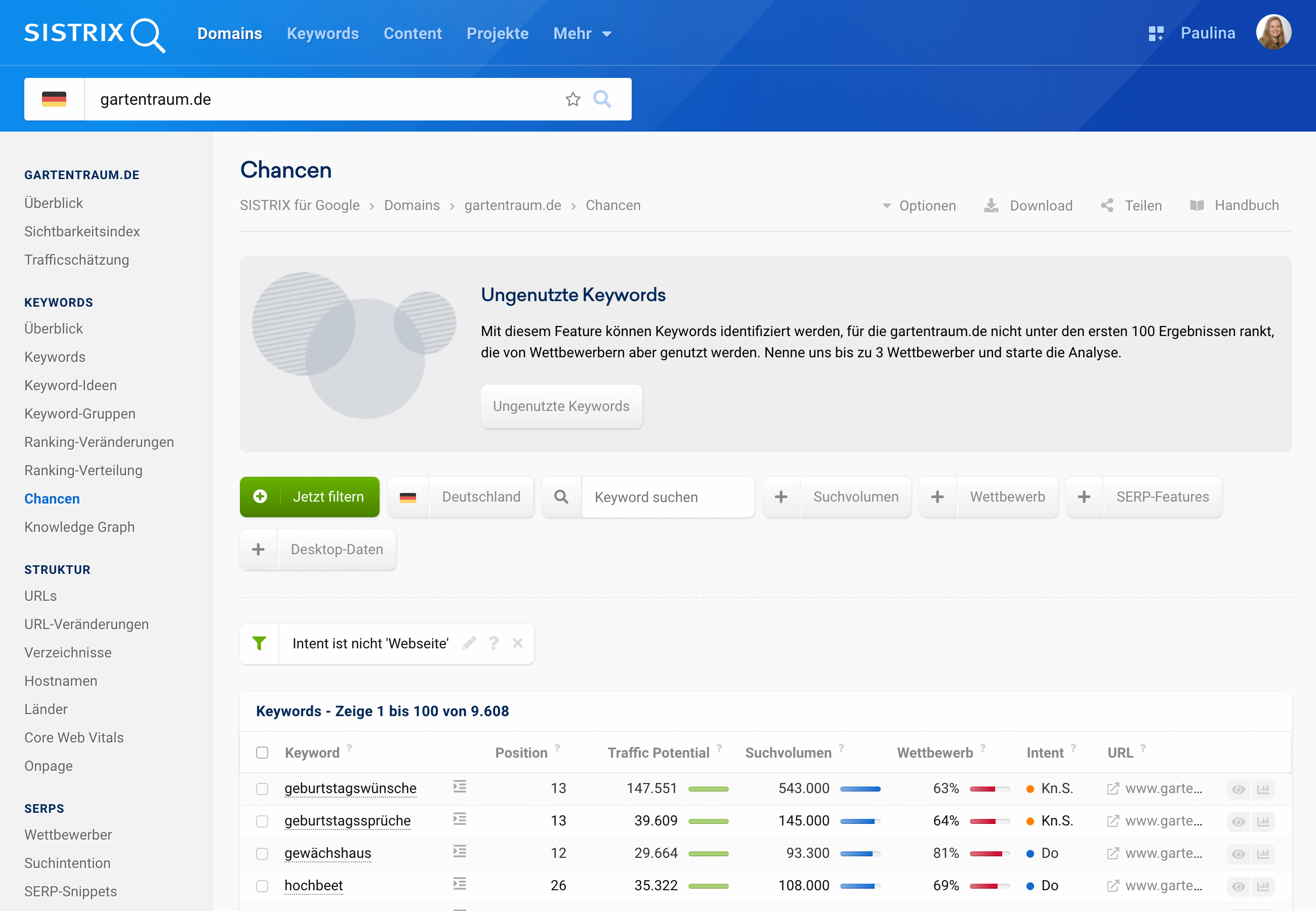 "Die Keyword-Chancen-Tabelle der Domain gartentraum.de.
