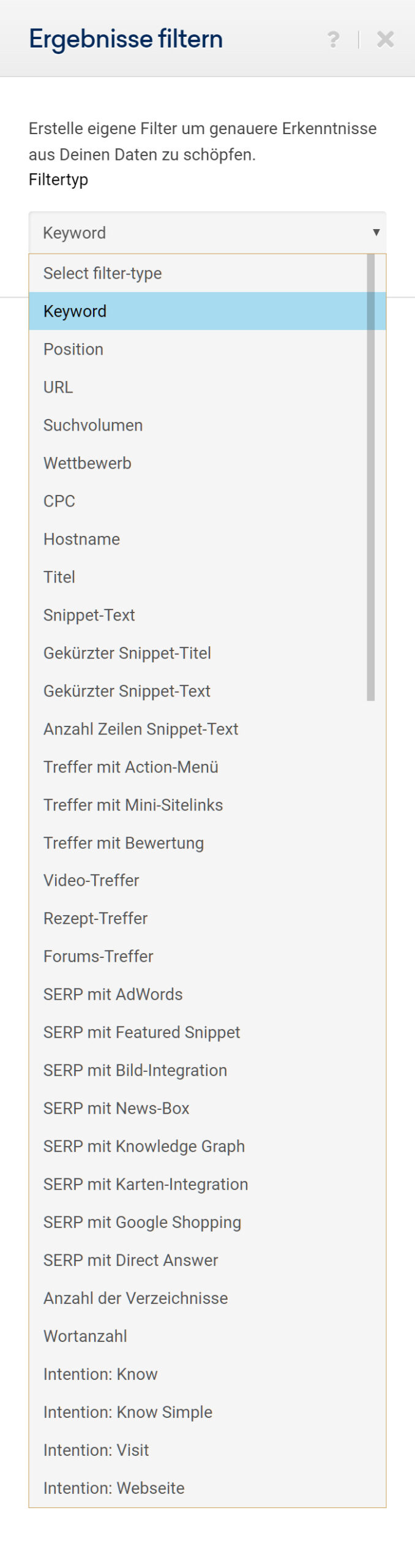 Nur bei größeren Domains mit sehr vielen Keywords wird dieser Filter nicht angezeigt, da die Datenmenge dann zu groß ist. Versuche in diesem Fall, dir einen bestimmten Bereich – zum Beispiel ein spezielles Verzeichnis oder einen Host – der Domain herauszusuchen und untersuche diesen auf Keyword-Kannibalismus.