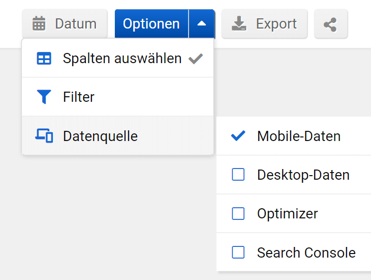 Hier kannst du außerdem den Expertenfilter aktivieren, um die verfügbaren Filter mit den boolschen Operatoren UND sowie ODER zu verknüpfen und damit umfangreiche Analysesituationen abzubilden. Standardmäßig (ohne aktivierten Expertenfilter) sind gleiche Filtertypen mit UND verbunden, unterschiedliche Filtertypen mit ODER. - Datenquelle: Wähle zwischen den Mobile– und Desktop-Daten. Standardmäßig zeigen wir die Mobile-Daten, da darüber heute die meisten Suchen laufen. Die Desktop-Daten sind jedoch nur einen Knopfdruck entfernt.
