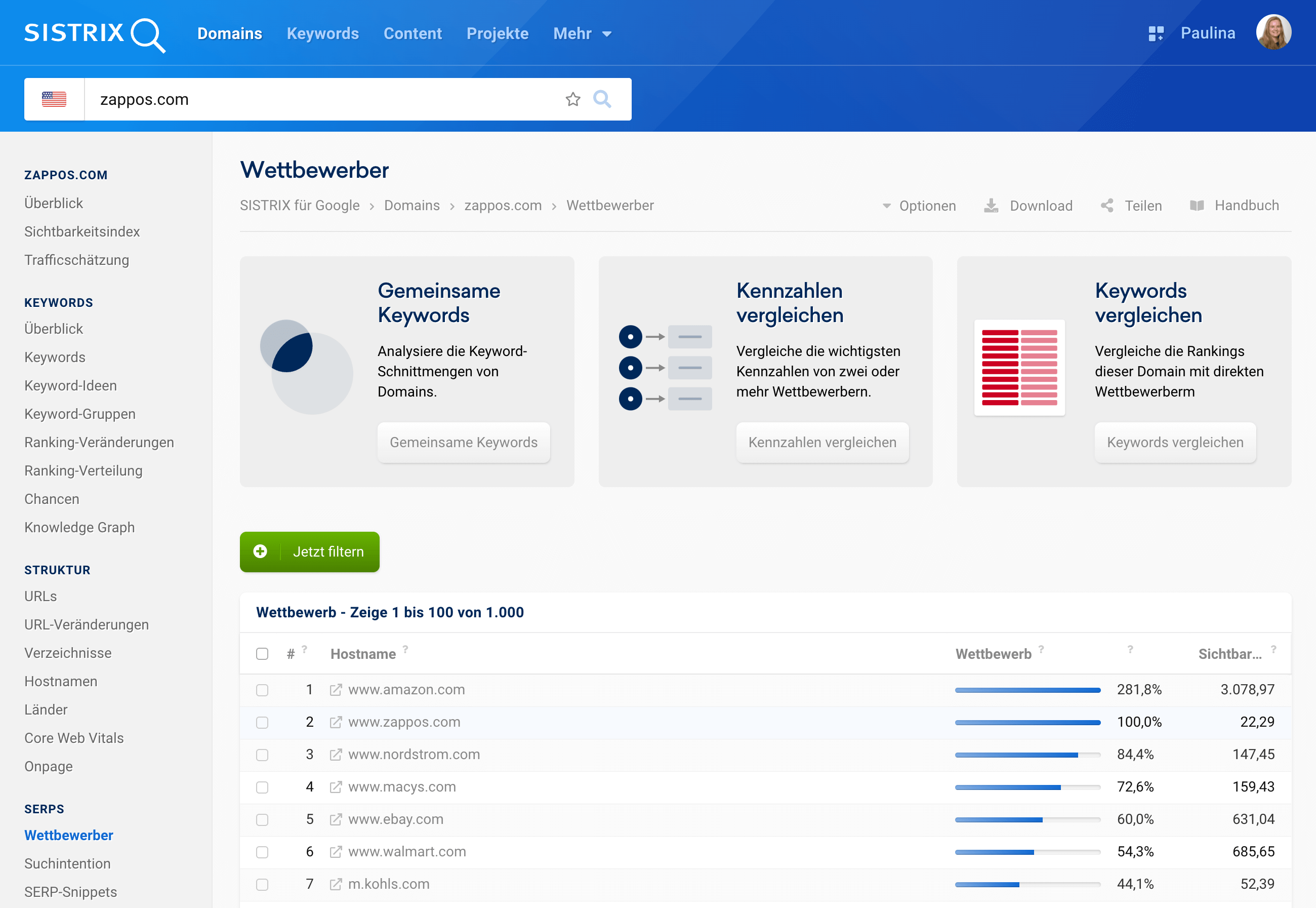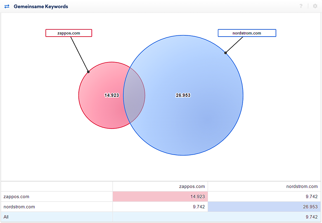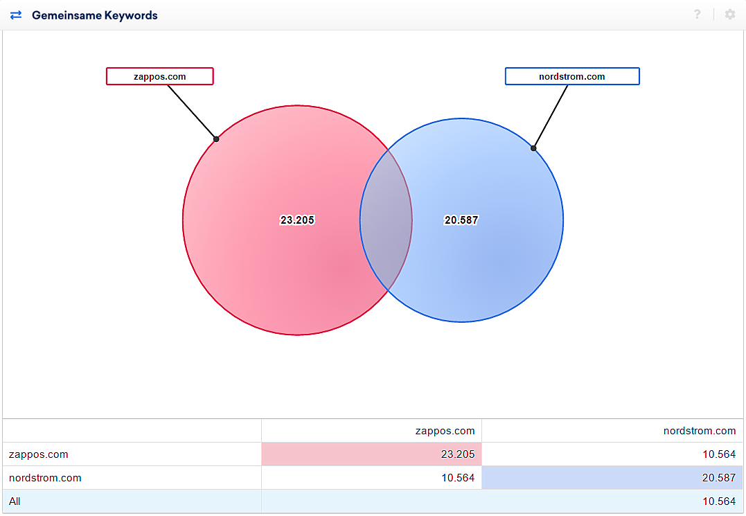 Wir können hieraus ablesen, dass nordstrom.com zu insgesamt 108.403 der 289.389 Keywords rankt, für die wir ein Google Ranking zu zappos.com finden konnten. Daraus resultiert eine Abdeckung von 37% aller zu Zappos gefundener Keywords durch Nordstrom. Wir können in diesem Fall davon ausgehen, dass Nordstrom einen starken Konkurrenten für Zappos darstellt.