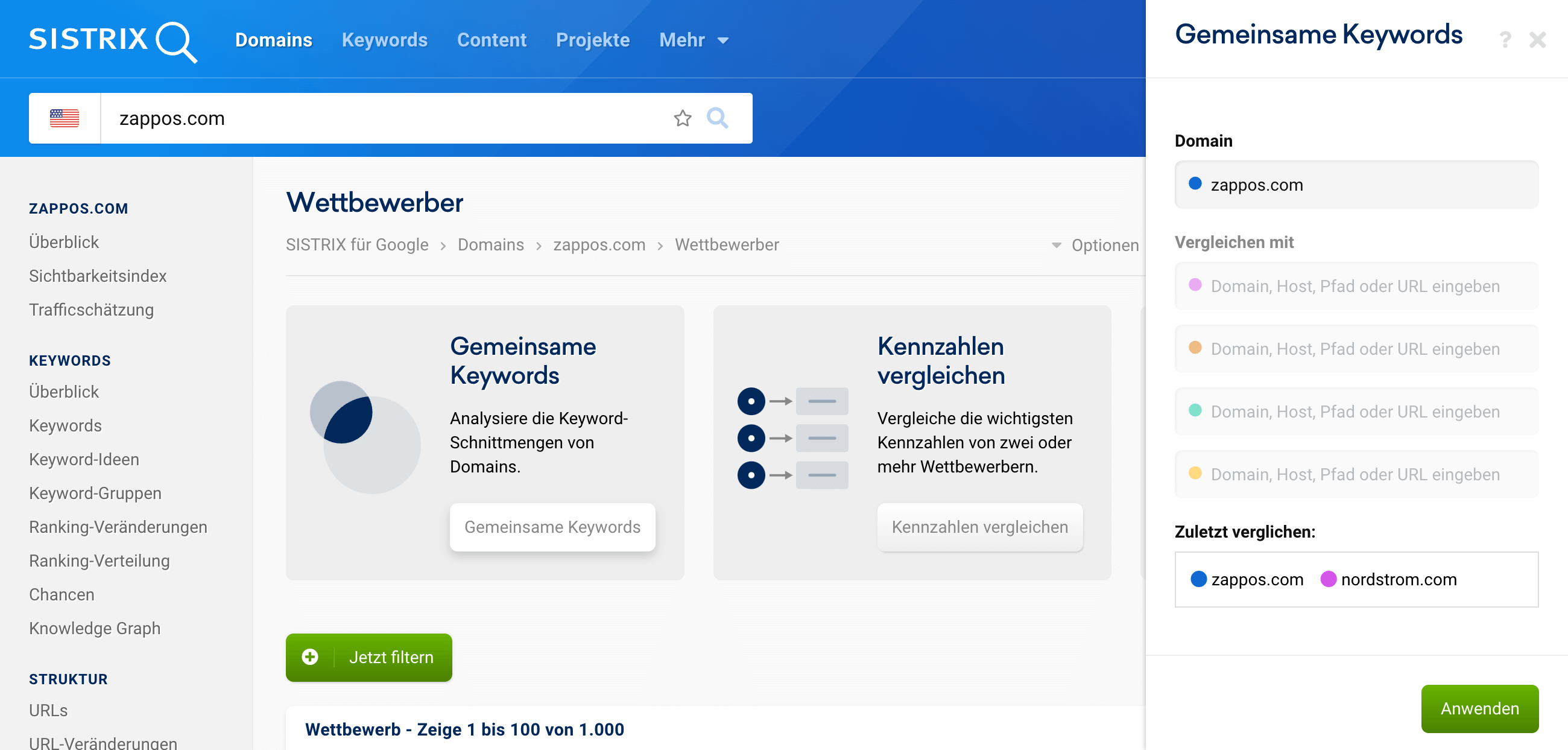 Umgekehrt könnten wir für Nordstrom herausfinden, welche weiteren Keywords von zappos.com für das eigene Portfolio interessant sein könnten. Weitere Informationen dazu findest du in unserem Tutorial „Neue Keyword-Chancen durch Wettbewerber finden“.