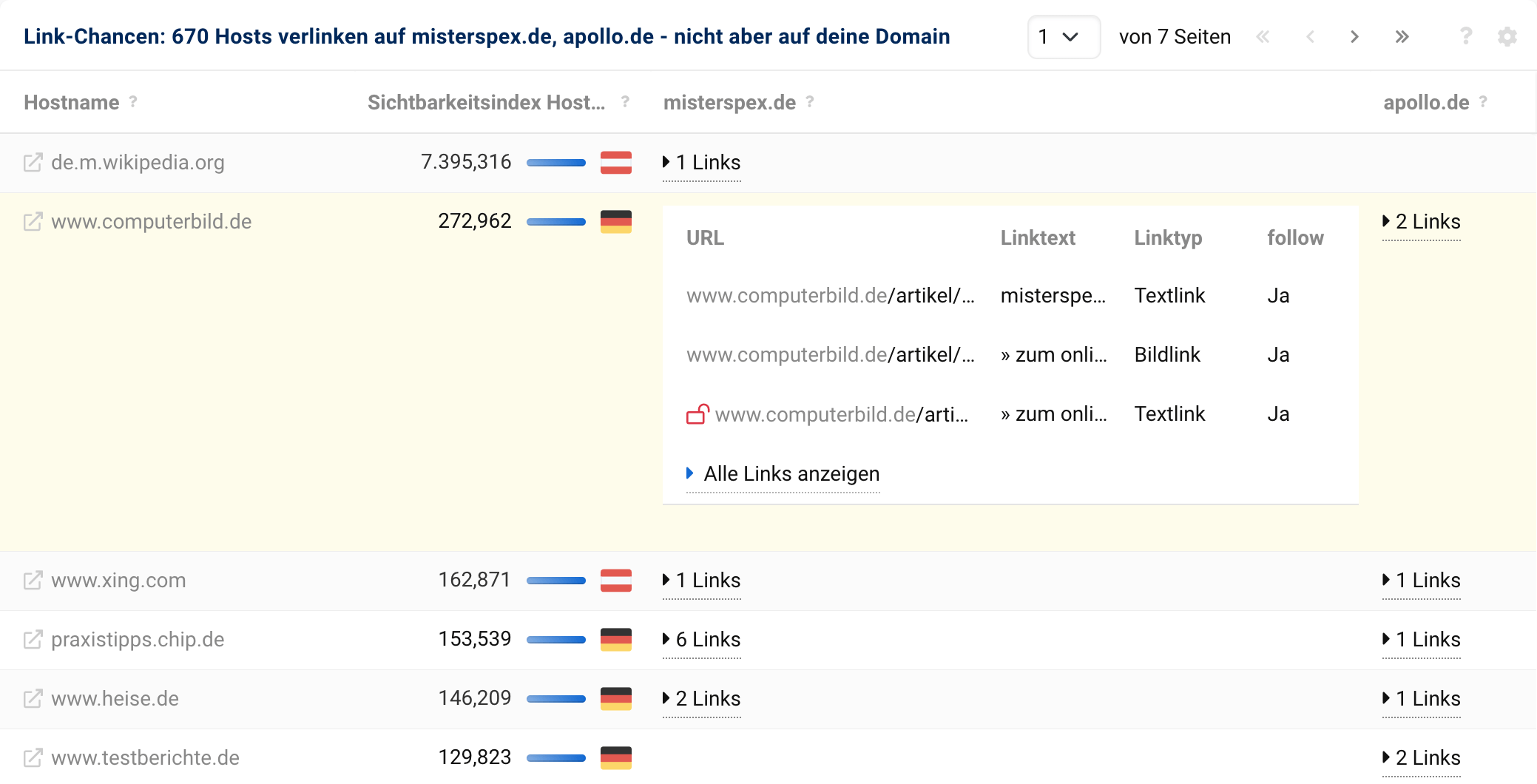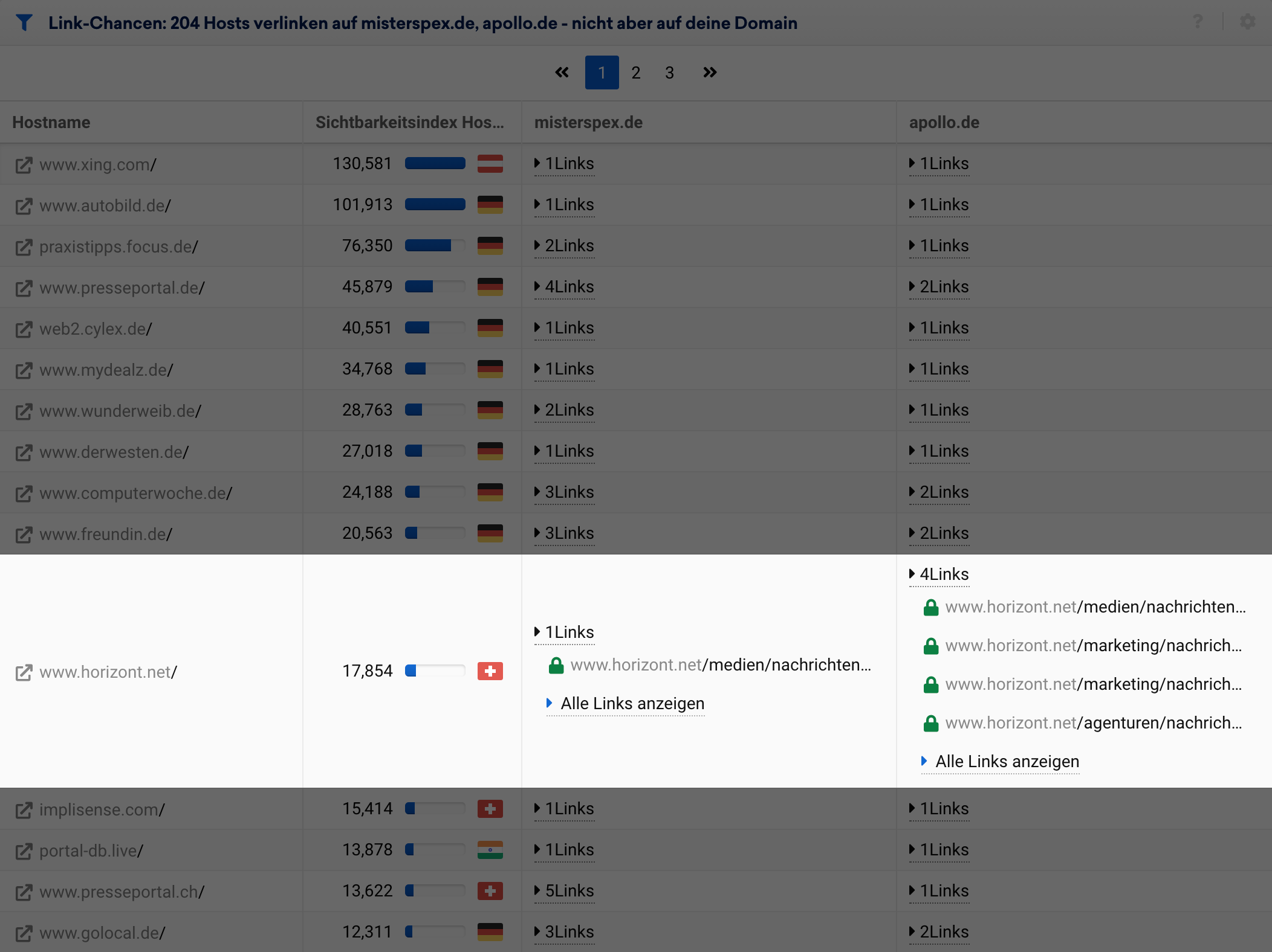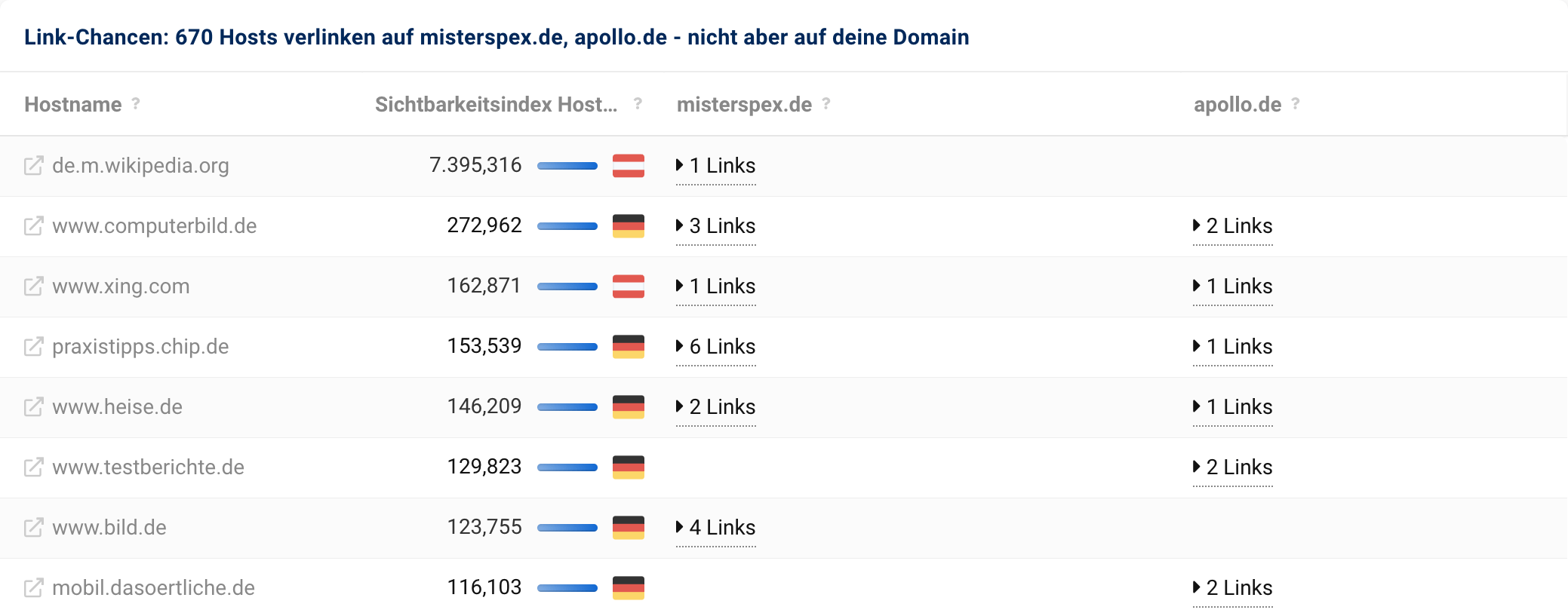 In der Übersicht der Ergebnisse sehen wir anhand unseres Beispiels lensbest.de, dass insgesamt 670 Hosts sowohl auf misterspex.de als auch auf apollo.de mit jeweils mindestens einem Link verlinken, auf lensbest.de jedoch nicht.