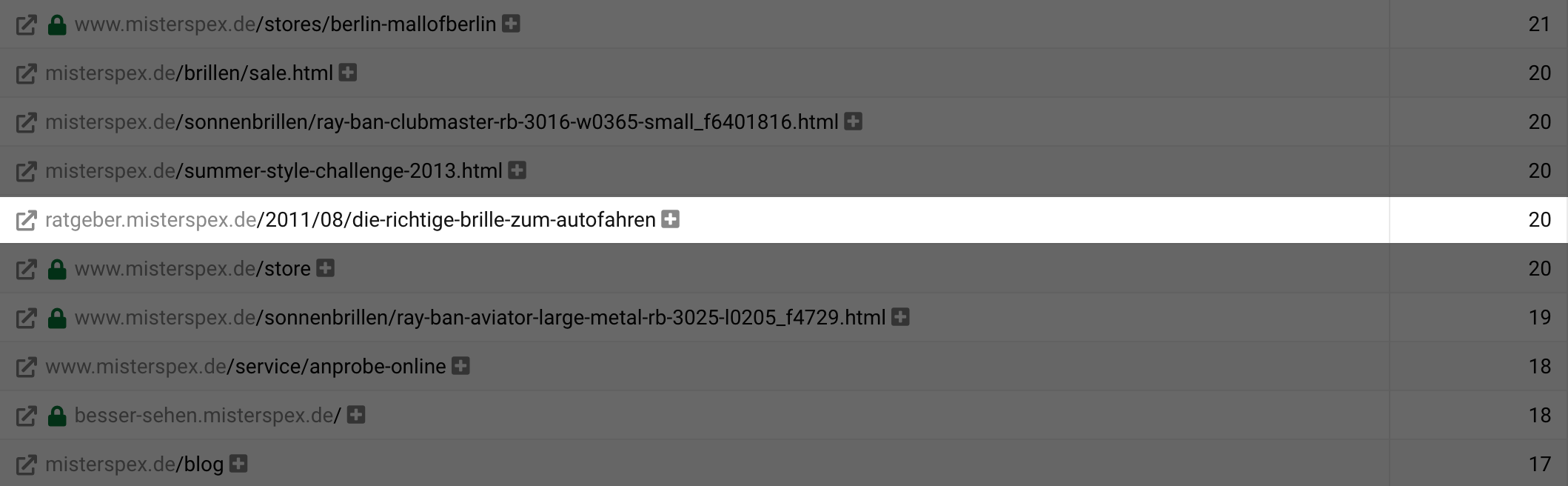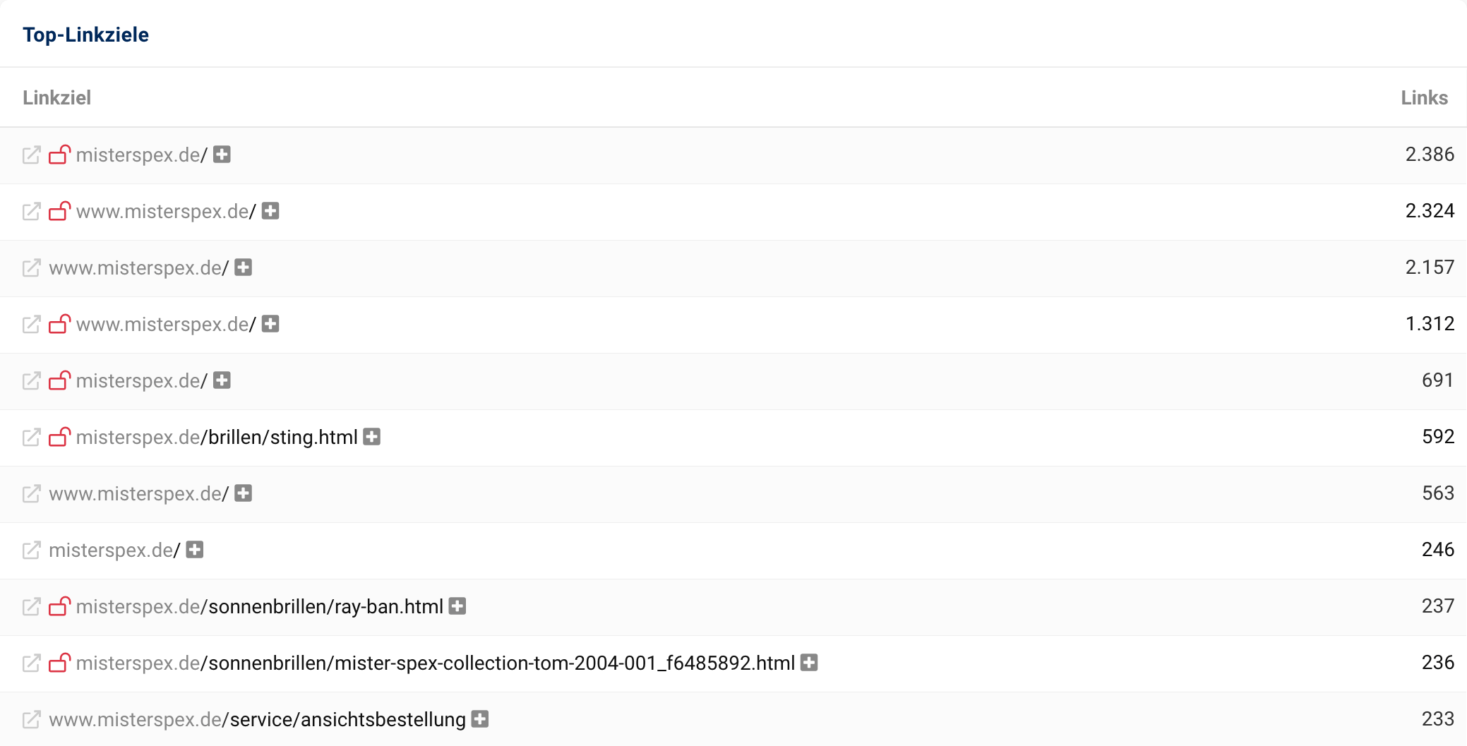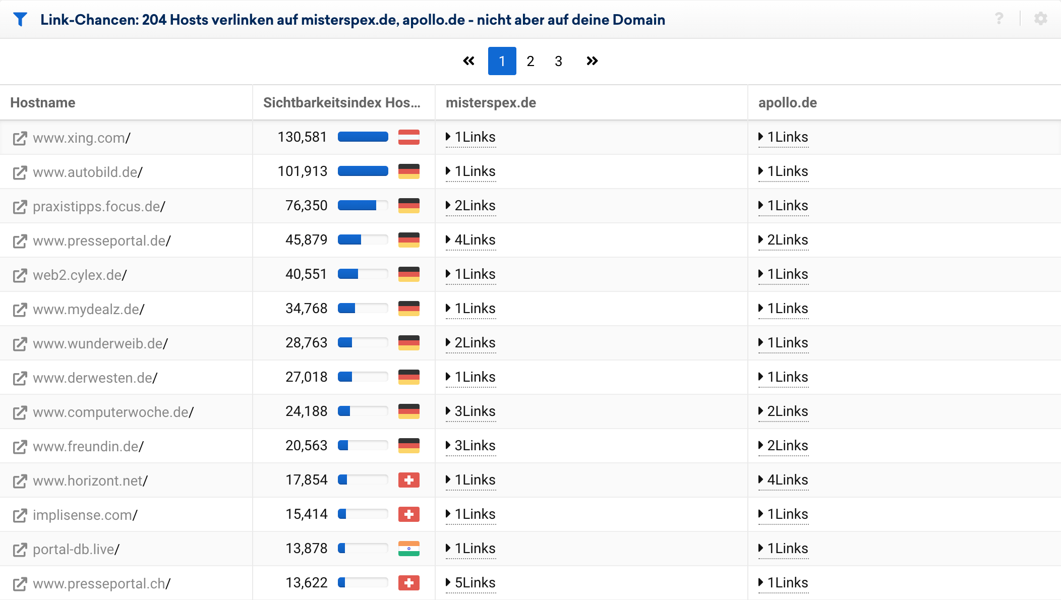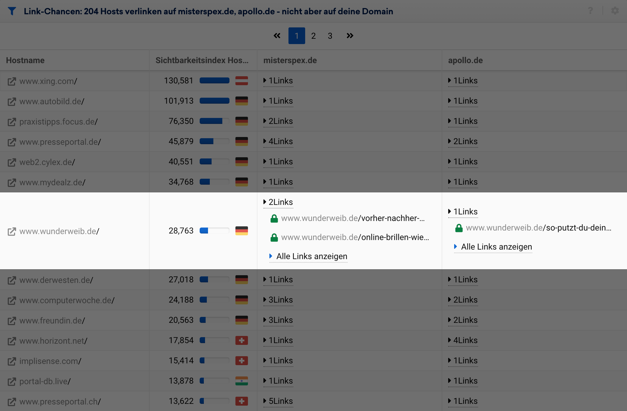 In der Übersicht der Ergebnisse sehen wir anhand unseres Beispiels lensbest.de, dass insgesamt 670 Hosts sowohl auf misterspex.de als auch auf apollo.de mit jeweils mindestens einem Link verlinken, auf lensbest.de jedoch nicht.