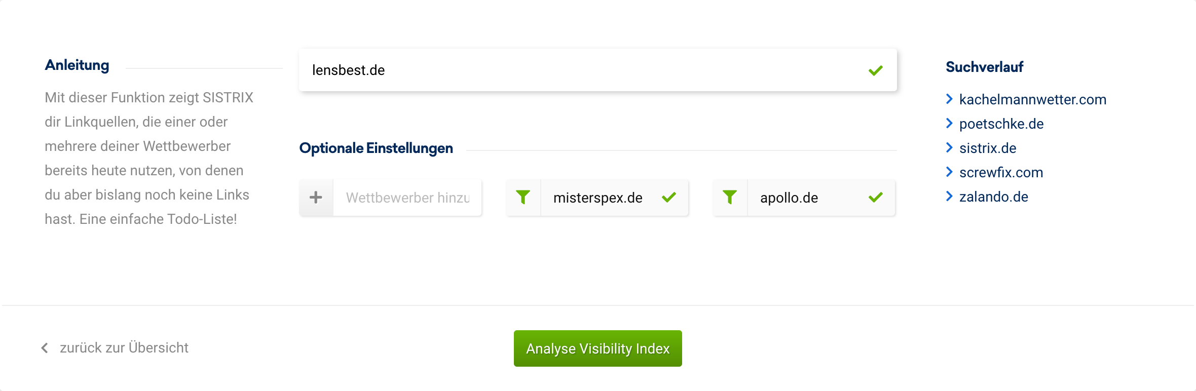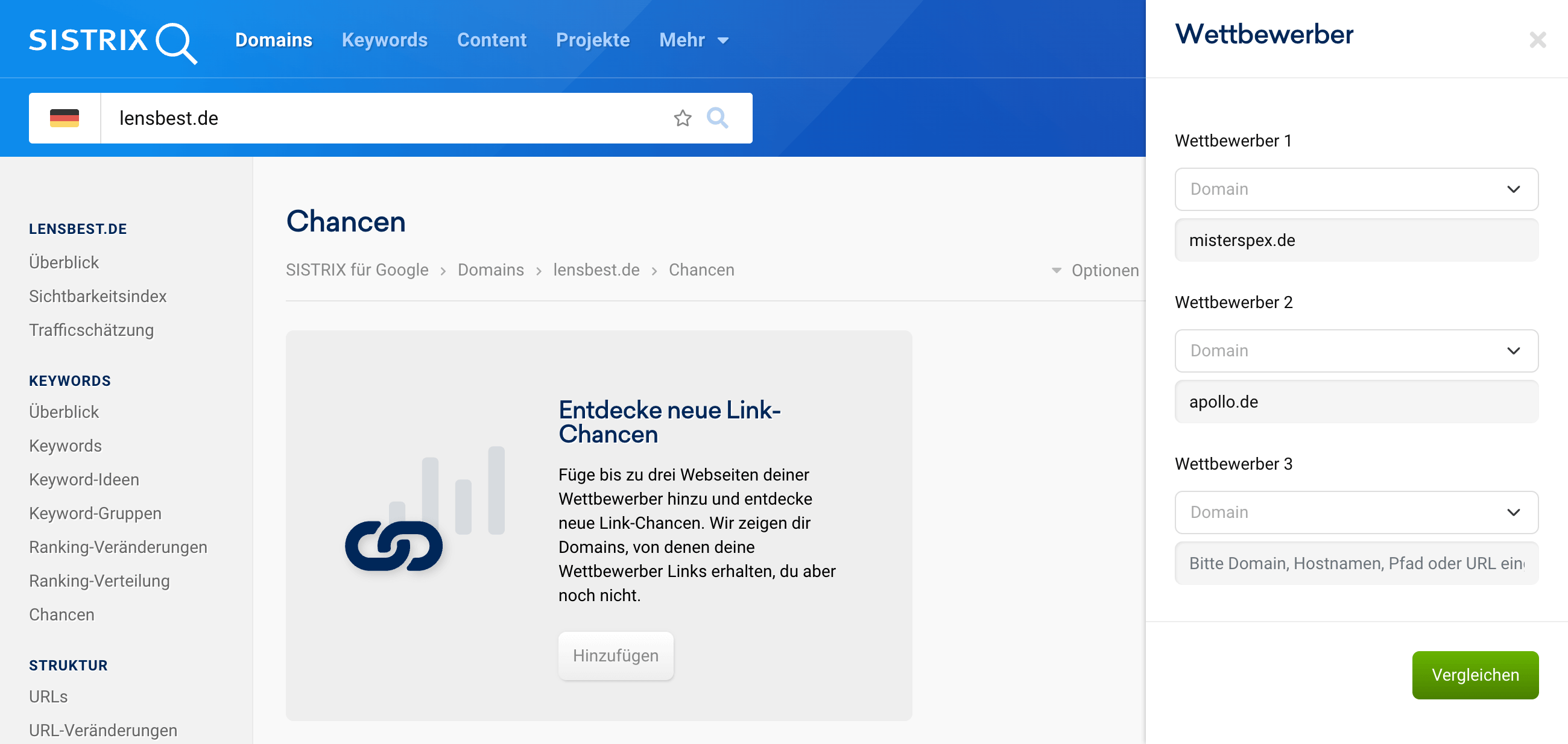 Im Interface können bis zu 3 Wettbewerber eingegeben werden. Anschließend startest du die Analyse. Als Beispiel vergleichen wir Online-Optiker.