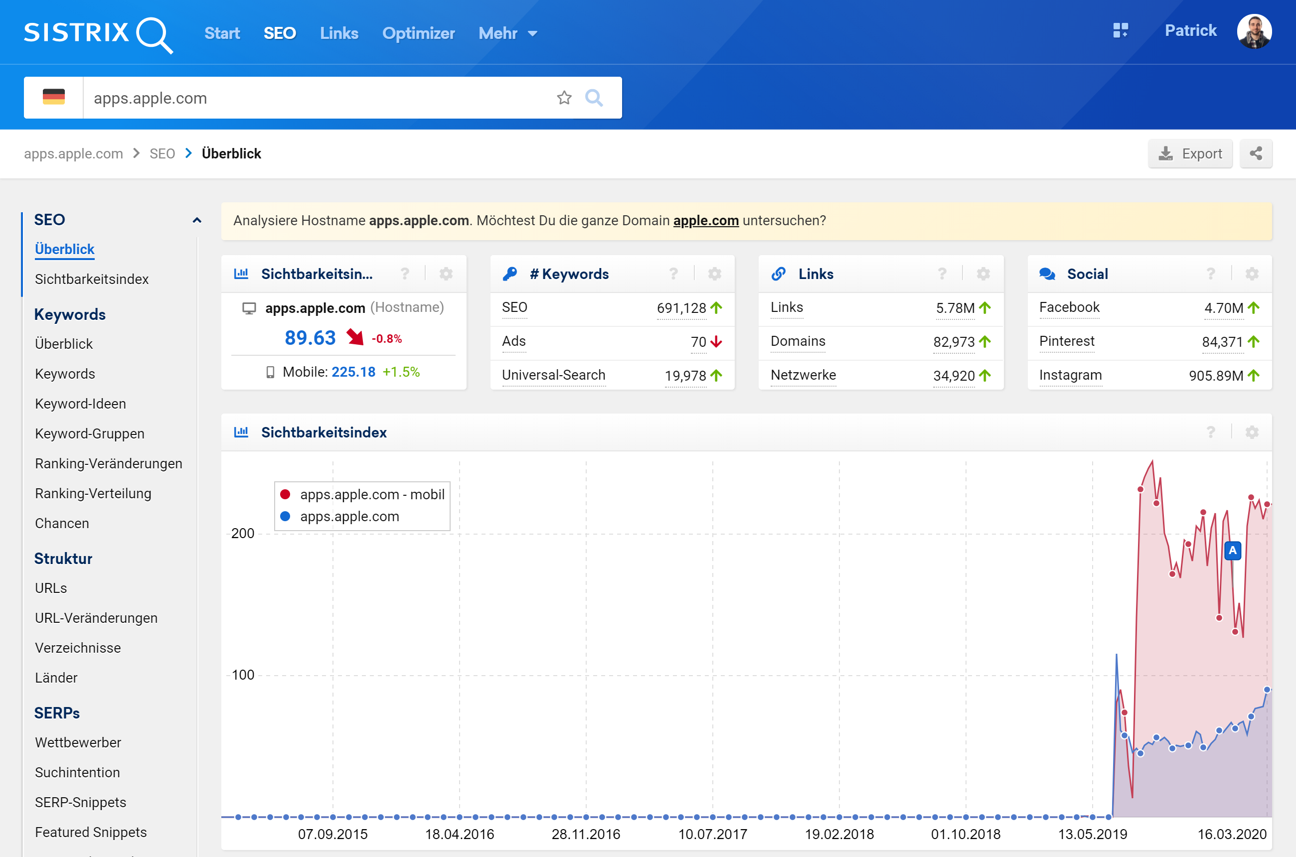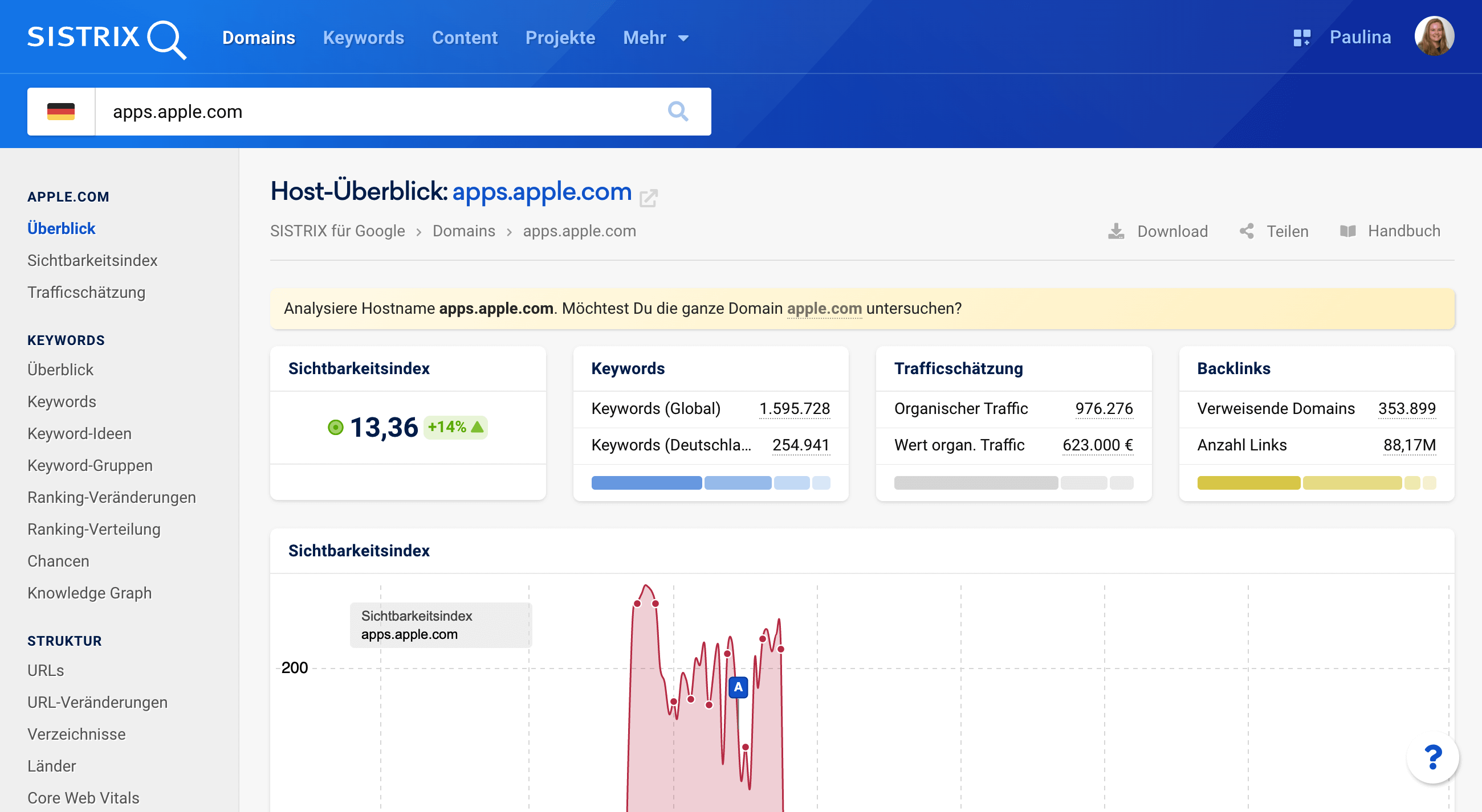 Auf der Seite des Hostüberblicks findest du die wichtigsten Kennzahlen zu diesem Host: Den Sichtbarkeitswert, Zahlen zu den Keywords des Hosts, Trafficzahlen, Angaben zu den Backlinks und du findest dort den Graphen des Sichtbarkeitsverlaufs sowie interessante Rankings.