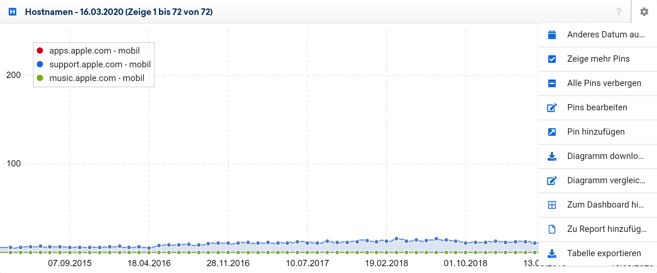 Im Verlauf oberhalb der Tabelle sehen wir, dass der apps-Host Mitte 2019 sprungartig aus dem Boden geschossen ist. Normalerweise ein sehr gutes Zeichen, dass hier ein oder mehrere andere Hosts auf einen neuen zusammengefasst wurden.