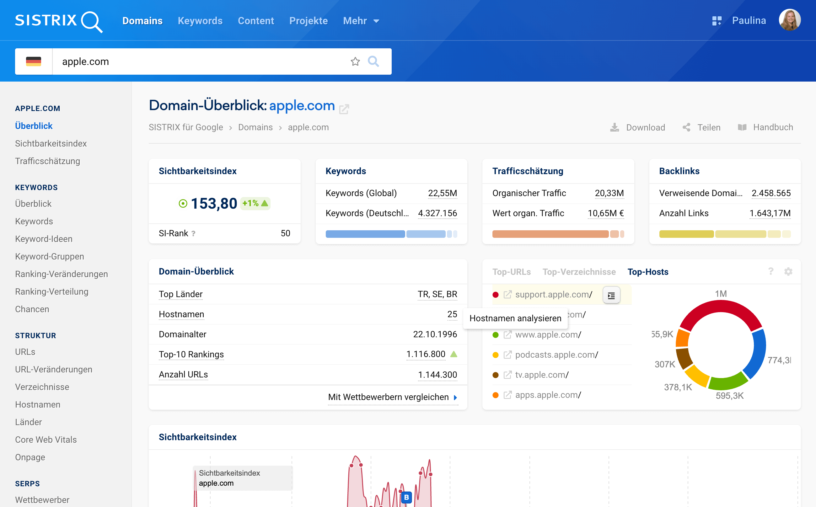 Einen Gesamtüberblick über alle Hosts der Domain findest du in der Tabelle unter dem Sichtbarkeitsverlauf.