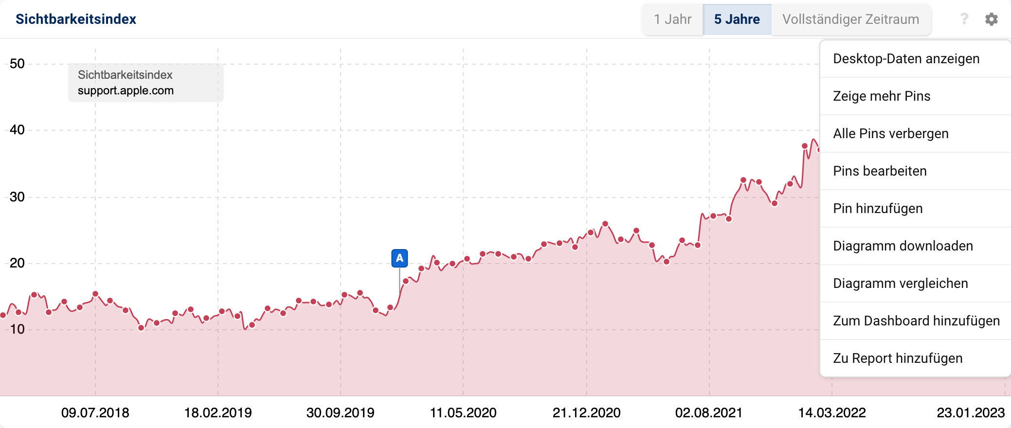 Dabei hilft die Option „Diagramm vergleichen“, erreichbar wieder über das Zahnrad oben rechts. Dort können wir einfach itunes.apple.com als weitere Linie hinzufügen und voilà: