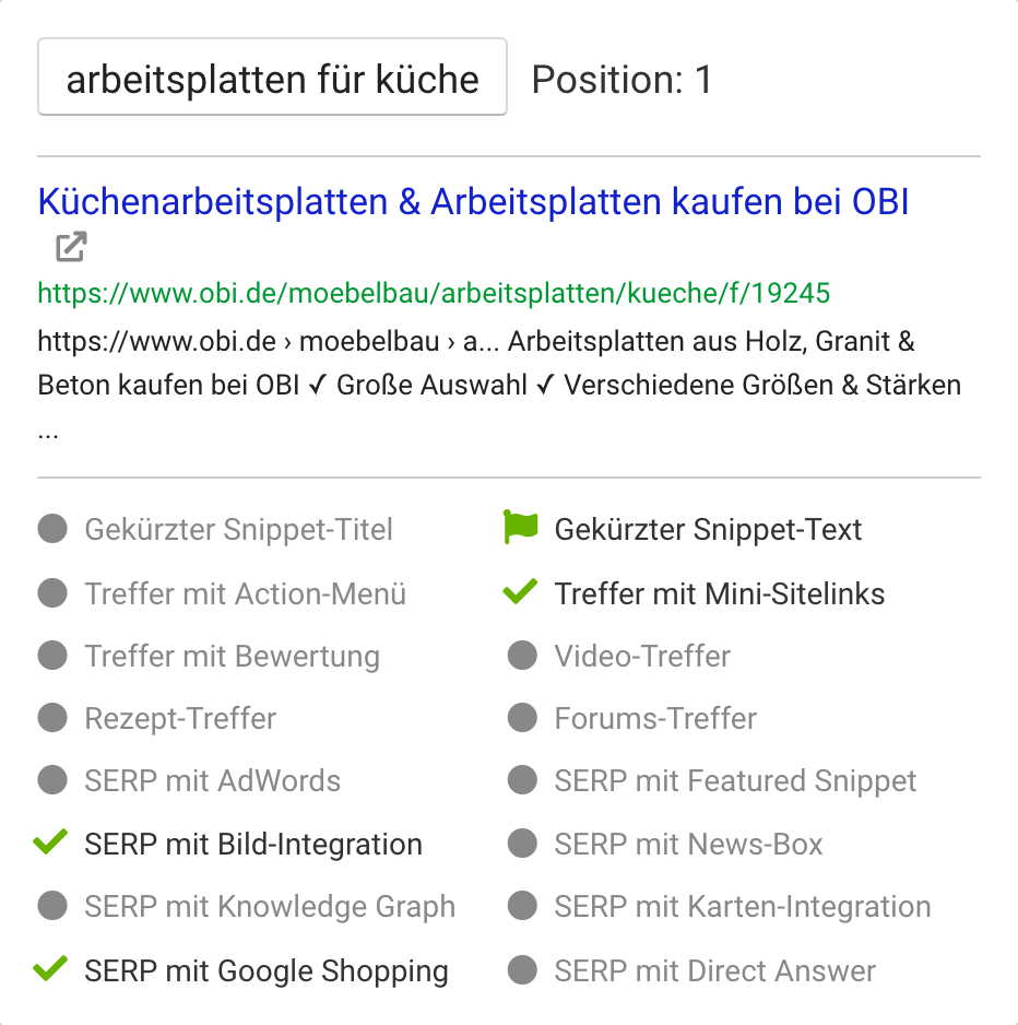Der Button „SERP-Features“ führt dich zu einer Liste verfügbarer SERP-Features. Aktiviere entsprechende Features und du siehst nur die URLs zu Keywords, bei denen Google ebendiese Features anzeigt.