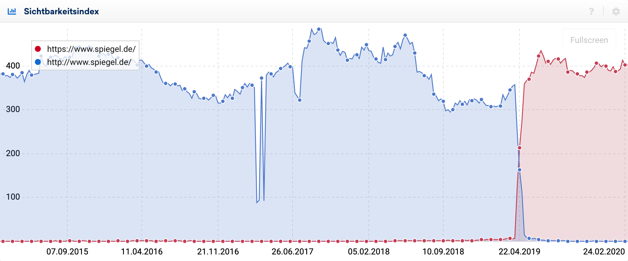 Im direkten Sichtbarkeitsvergleich können wir schon sehen, dass die Sichtbarkeit nahtlos, innerhalb weniger Wochen von HTTP-URLs auf HTTPS-URLs übergegangen ist.