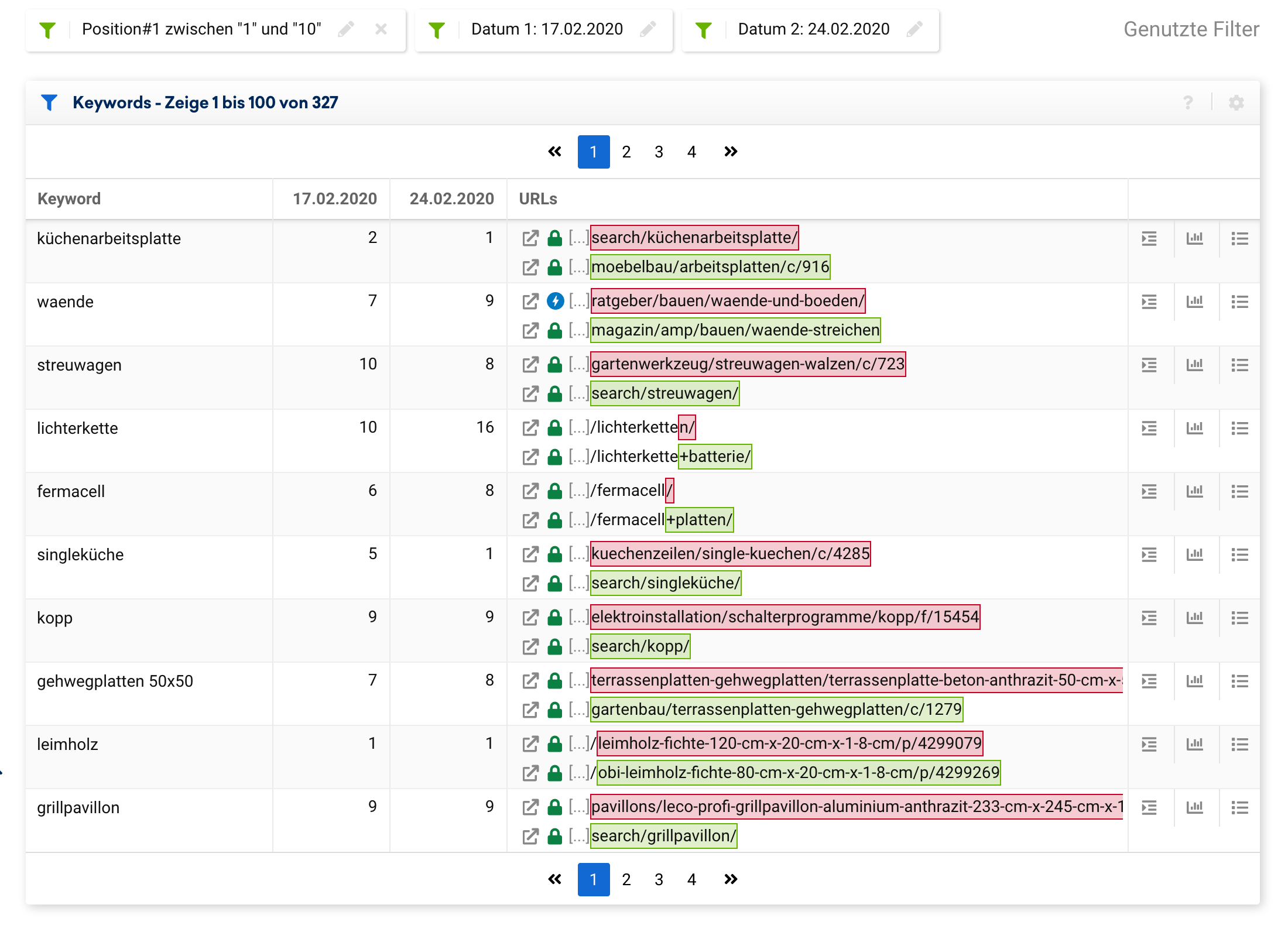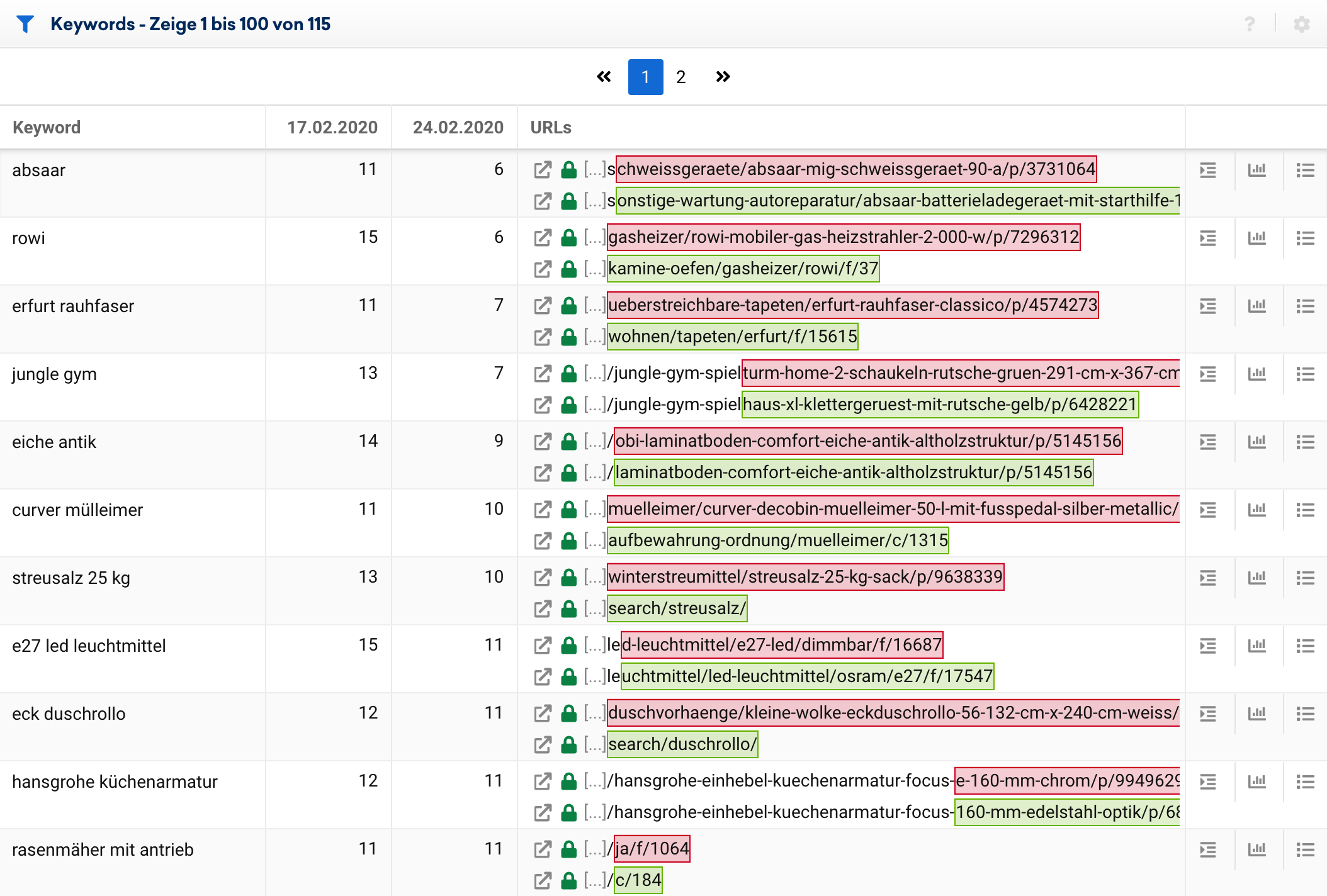 In rot ist jeweils die URL markiert, die zum ersten Zeitpunkt gerankt hat. In grün dementsprechend die URL, die zum zweiten, späteren Zeitpunkt für das entsprechende Keyword gerankt hat.