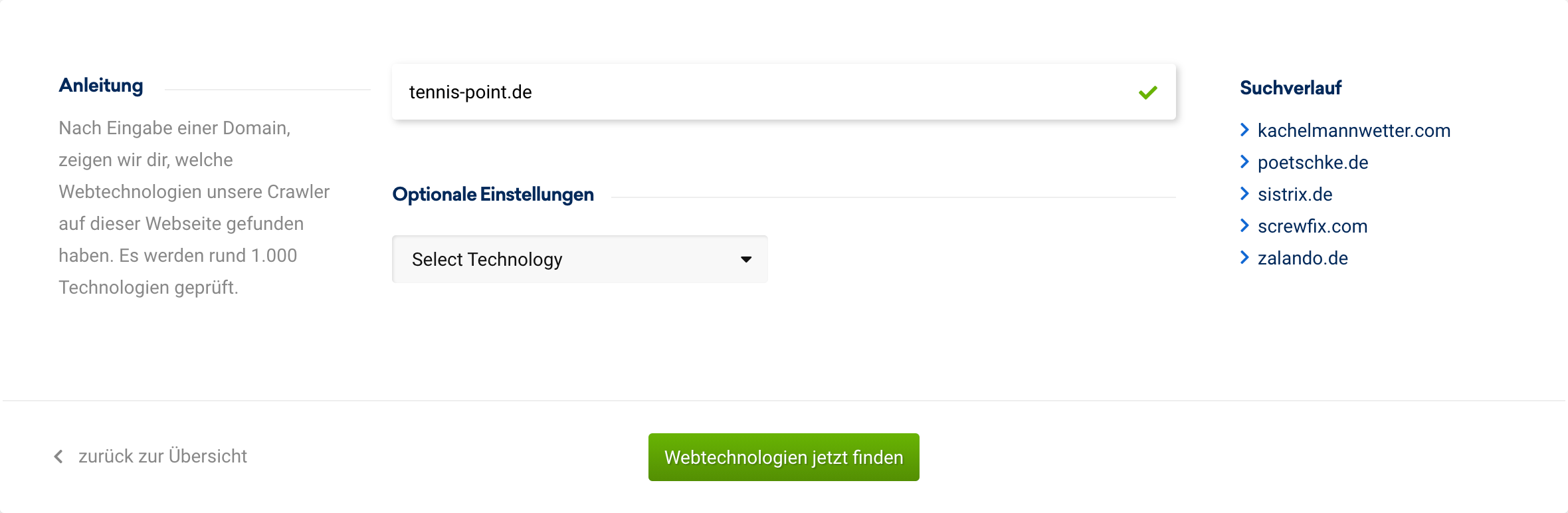Nun geben wir die Domain ein, welche wir untersuchen wollen. In unserem Beispiel schauen wir uns die Technologien von tennis-point.de an.
