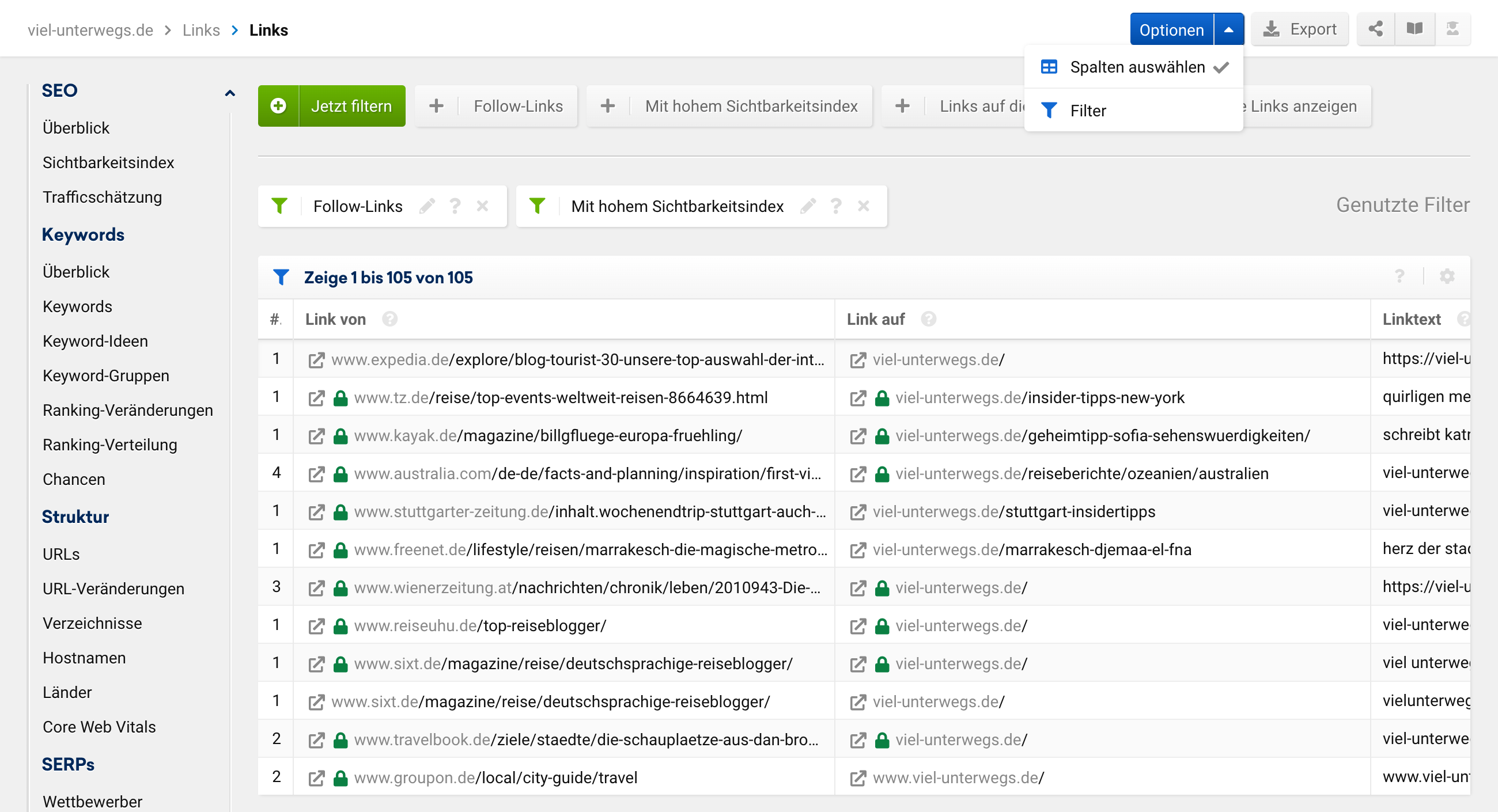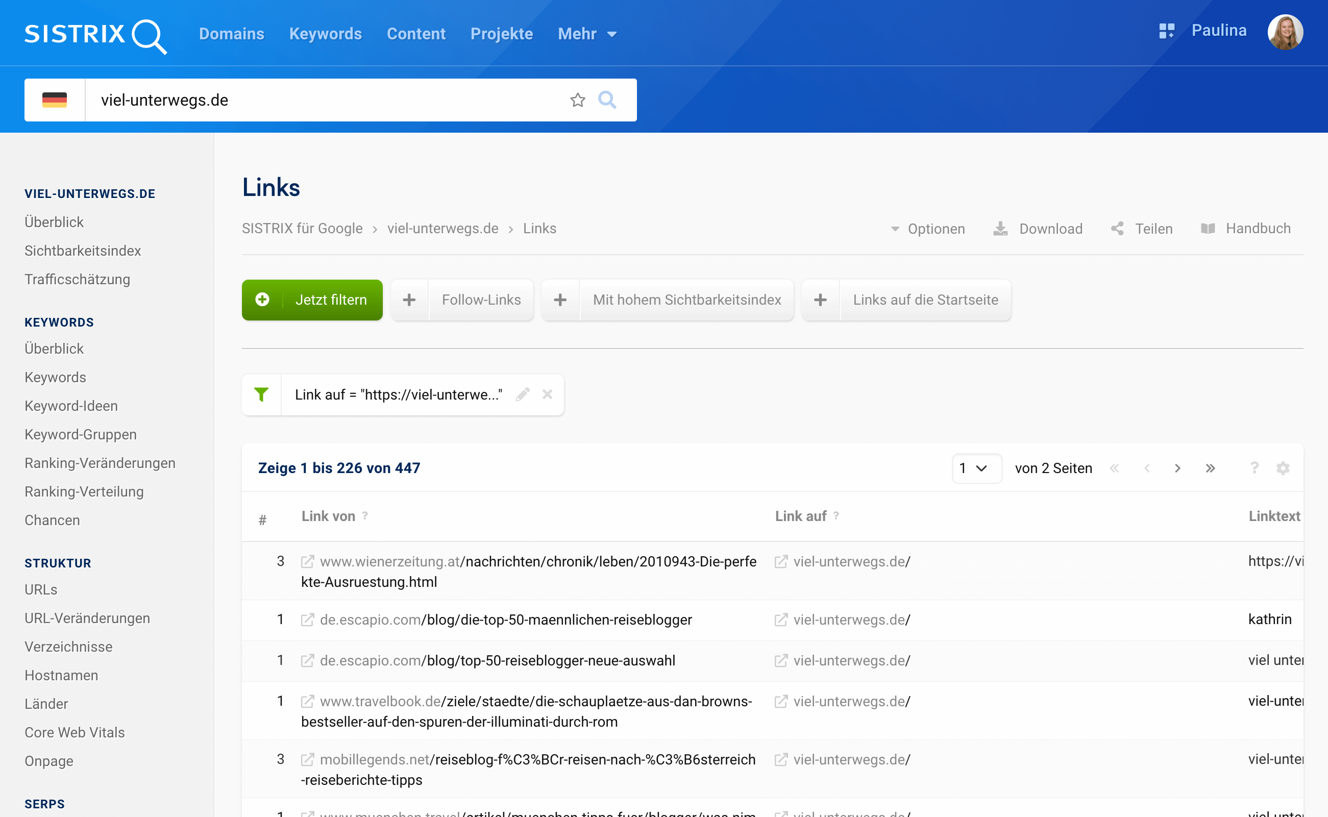 Wie du merkst, führen dich viele Wege innerhalb SISTRIX immer wieder zur Übersicht der einzelnen Links. Nutze die hier zur Verfügung stehenden Filter, denn sie helfen dir, viele relevante Links zu entdecken.