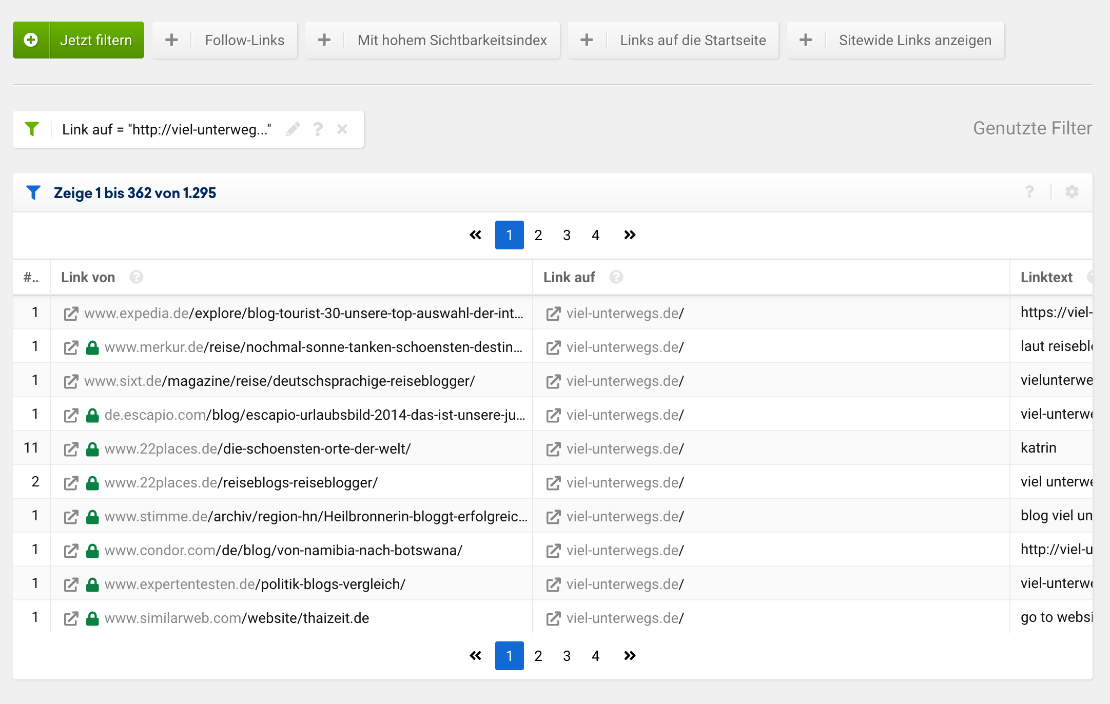 Du kannst die Ergebnisse darüber hinaus auch nach bestimmten Faktoren filtern. Im folgenden Screenshot wurde die Linktabelle nach “Follow-Links” 1 sowie “Mit hohem Sichtbarkeitsindex” 2 gefiltert, um Seiten zu zeigen, deren Verlinkung vermutlich viele Besucher bringen dürften.