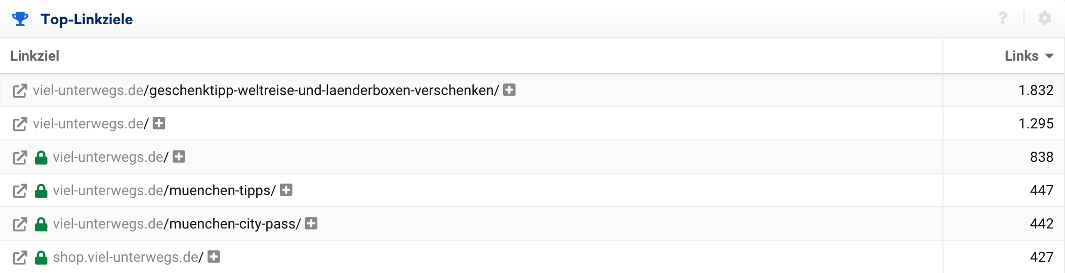 Im nächsten Schritt ist es interessant, sich die Verlinkungen einzelner Seiten anzuschauen. So kannst du herausfinden, welche Links einer einzelnen Unterseite zu einem guten Ranking verhelfen. Hierzu kannst du dir unter „Verlinkte Seiten” die Top-Linkziele deines Konkurrenten anschauen.