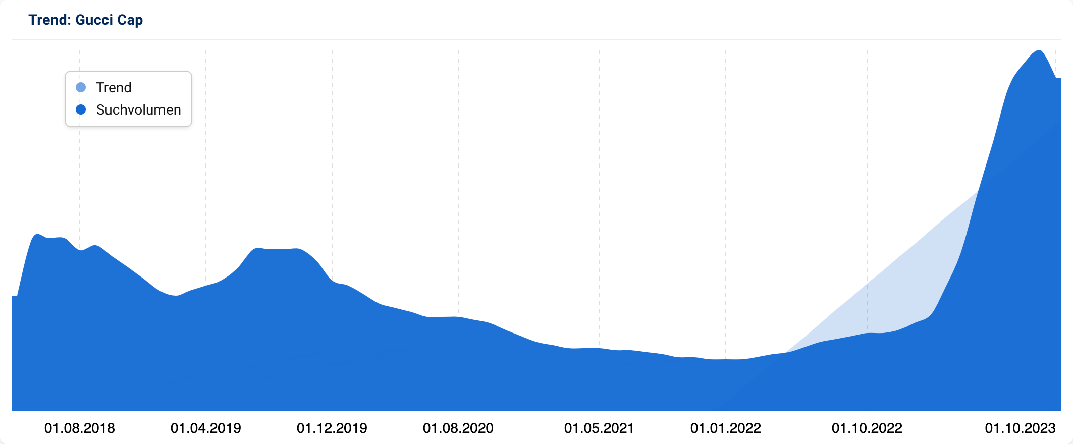Neben neuen Klamottenmarken, die von Influencern auf Social Media bekannt gemacht wurden, gibt es auch im Jahr 2023 immer noch Klassiker, die erfolgreich Marktanteile verteidigen. Beispiele dafür sind die Suchvolumen für Keywords wie “Gucci Cap” oder “Prada Sonnenbrille”, die in den vergangenen Monaten im Auftrieb waren.