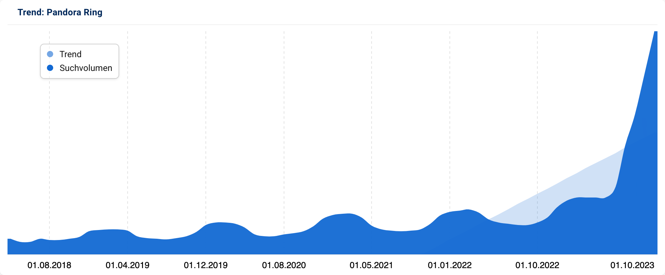 Bekannt macht sich Pandora immer wieder durch Kollektionen mit Popkultur-Referenz. So launchte man zuletzt beispielsweise Schmuck zum 100. Geburtstag von Disney und zum Serien-Megahit “Game of Thrones”. Der aktuell massive Anstieg des Suchvolumens zum Keyword “Pandora Ring” könnte aber einen anderen Grund haben: Via Tiktok ist ein Ring-Set aus Sonne und Mond zum riesigen Hype mit mehr als 4 Millionen Views geworden. Dahinter stecken offenbar auch Taylor-Swift-Fans, die den Ring mit der Songzeile “He was sunshine, I was midnight rain” verbinden.